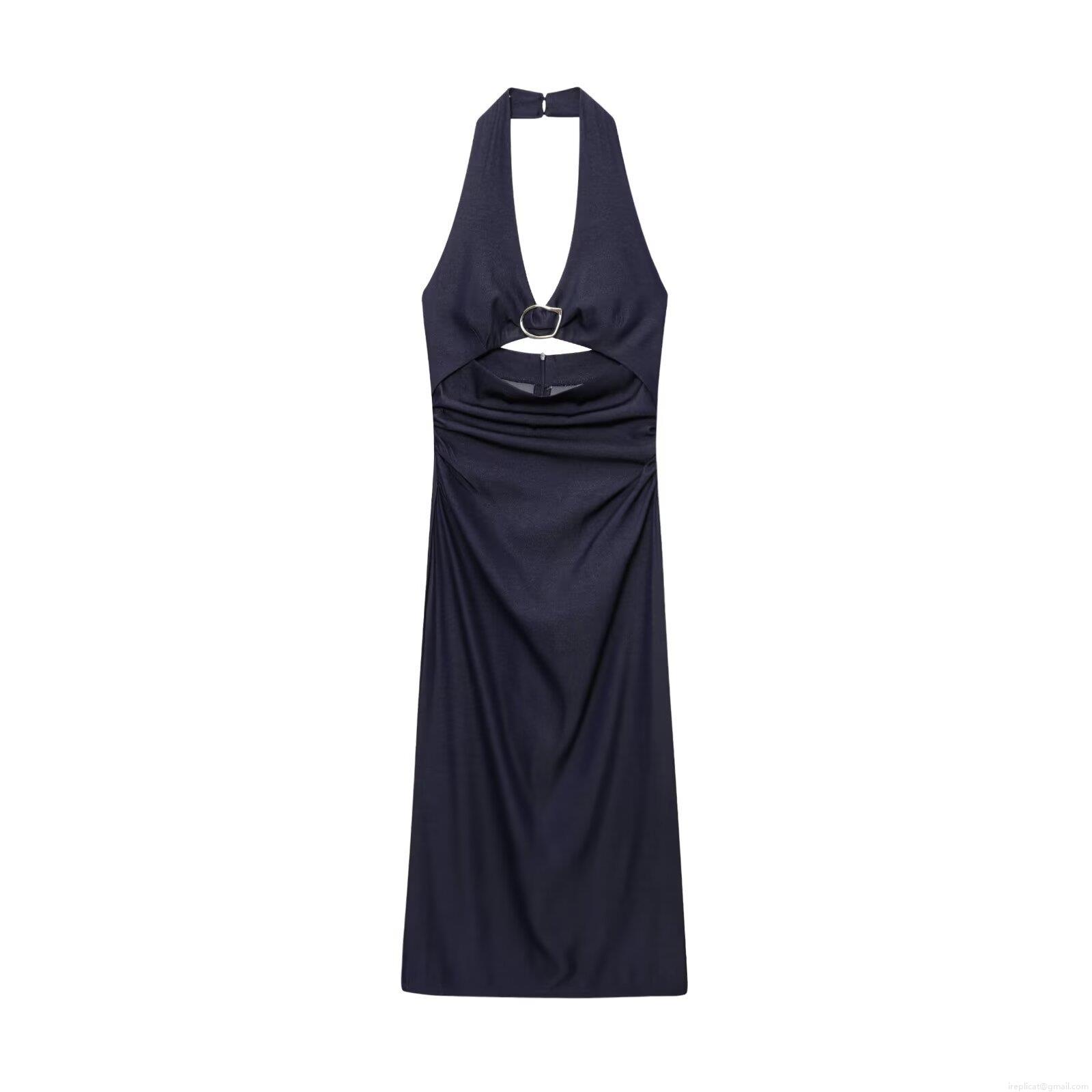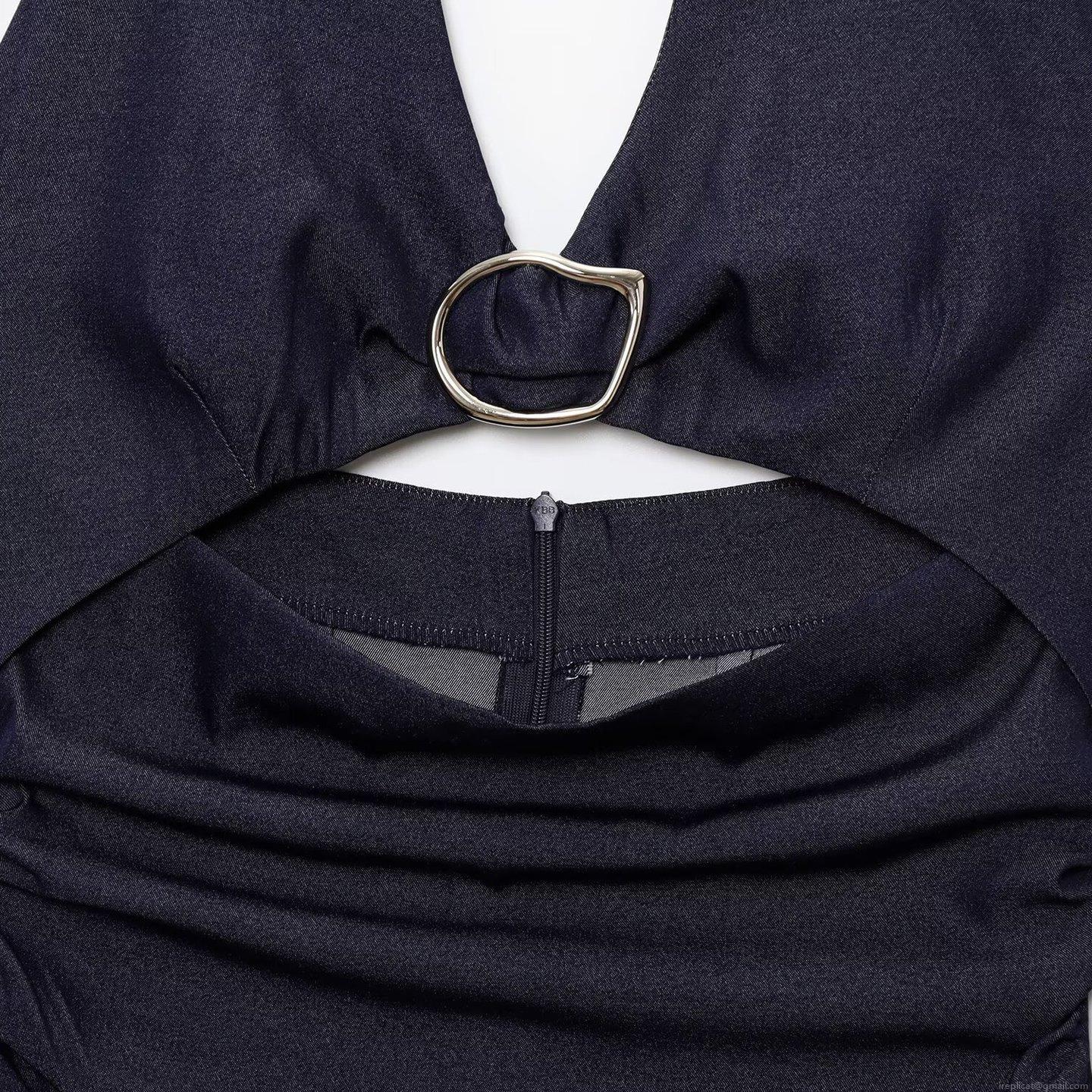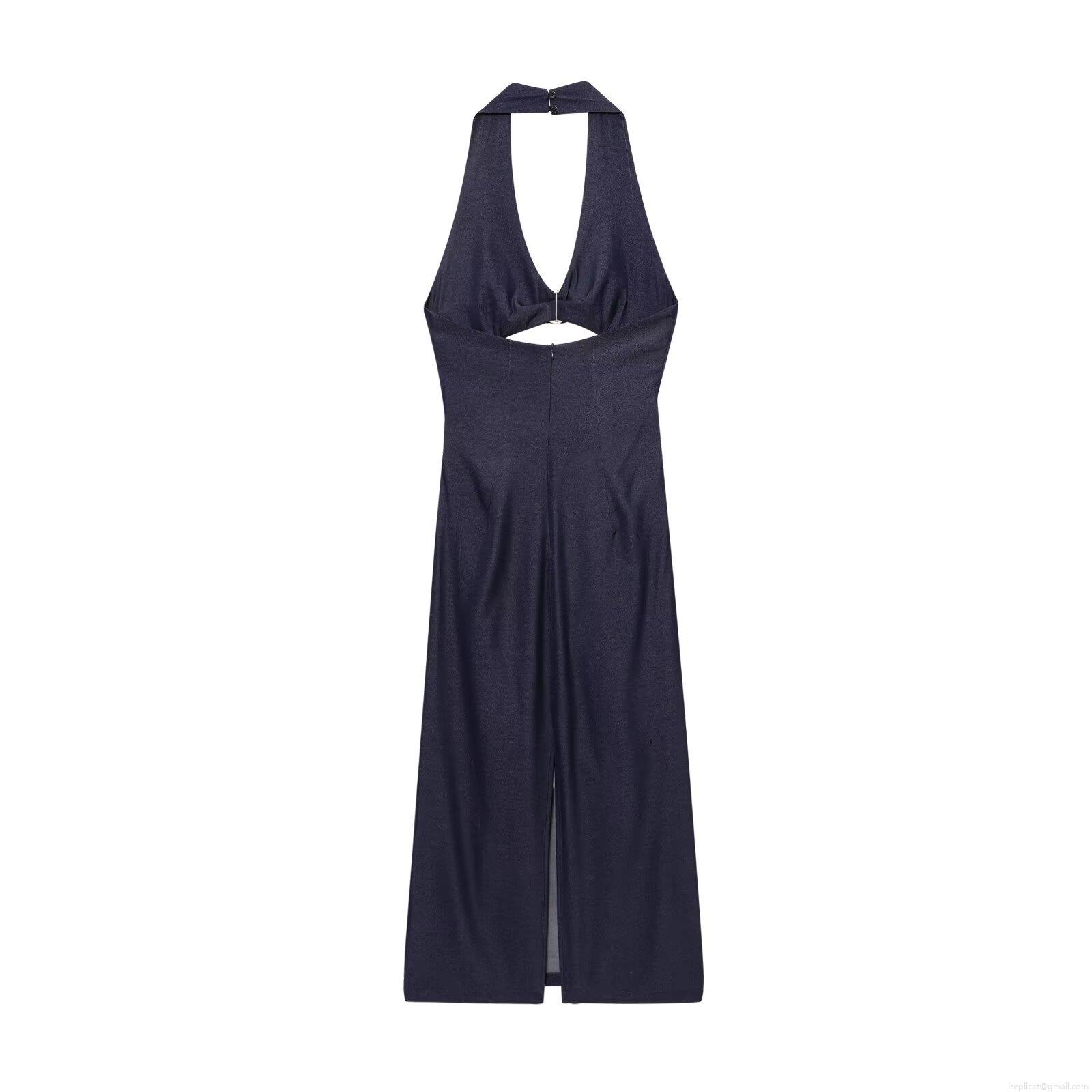 Sexy Navy Blue Halter Neck Midi Dress For Women Backless Cutout Design With Metal Ring Slit Hem Polyester Faux Denim Street Style Summer Bodycon Dresses