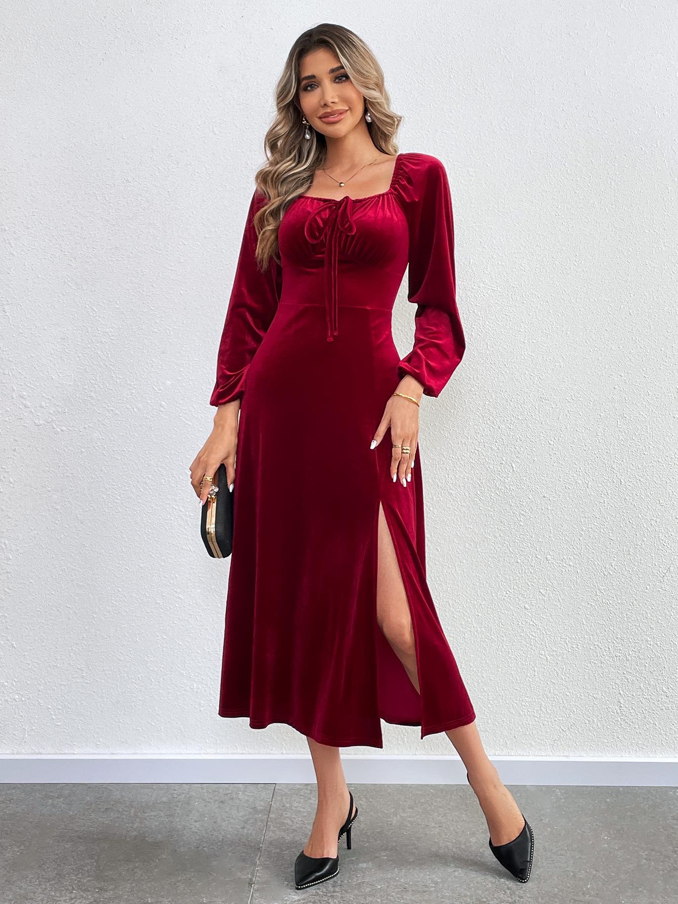 • Sexy Velvet Square Neck Long Sleeve High Split Midi Dress With Tie Front Elegant Bodycon Party Evening Dress For Women Solid Color Slim Fit A-Line Dress