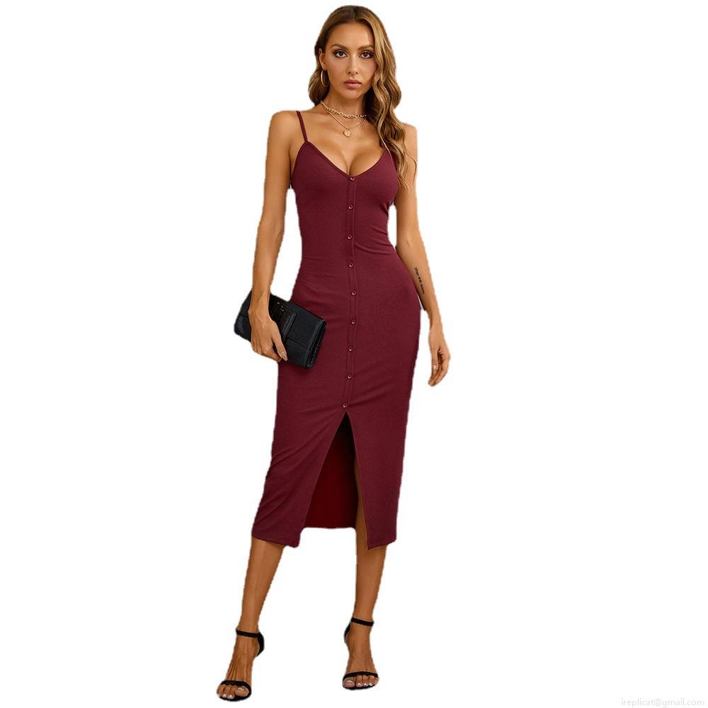 • Sexy V-Neck Sleeveless Spaghetti Strap Bodycon Dress For Women Rayon Polyester Spandex Ribbed Knit Button Front Split Hem Midi Party Vacation Summer Dress