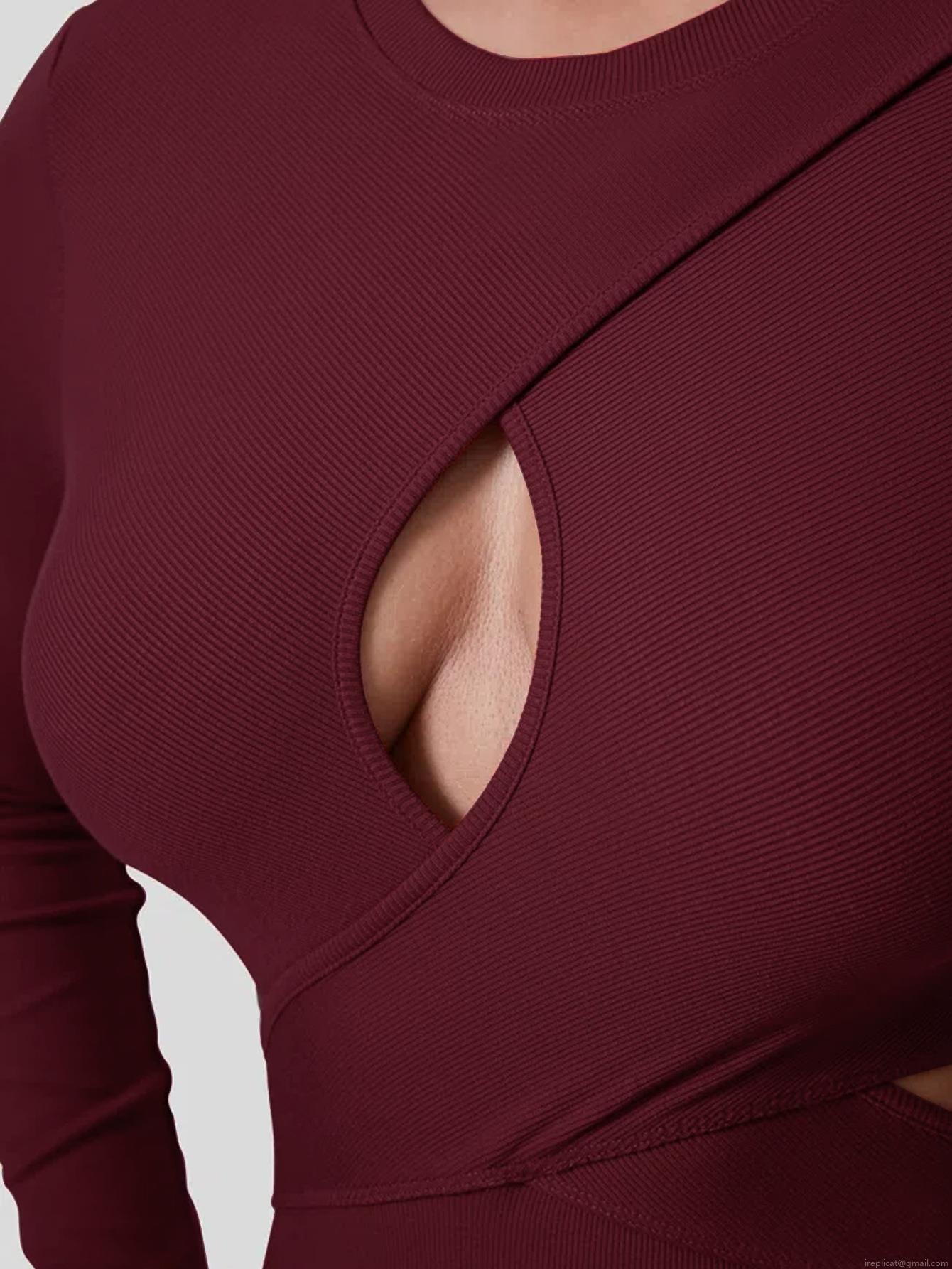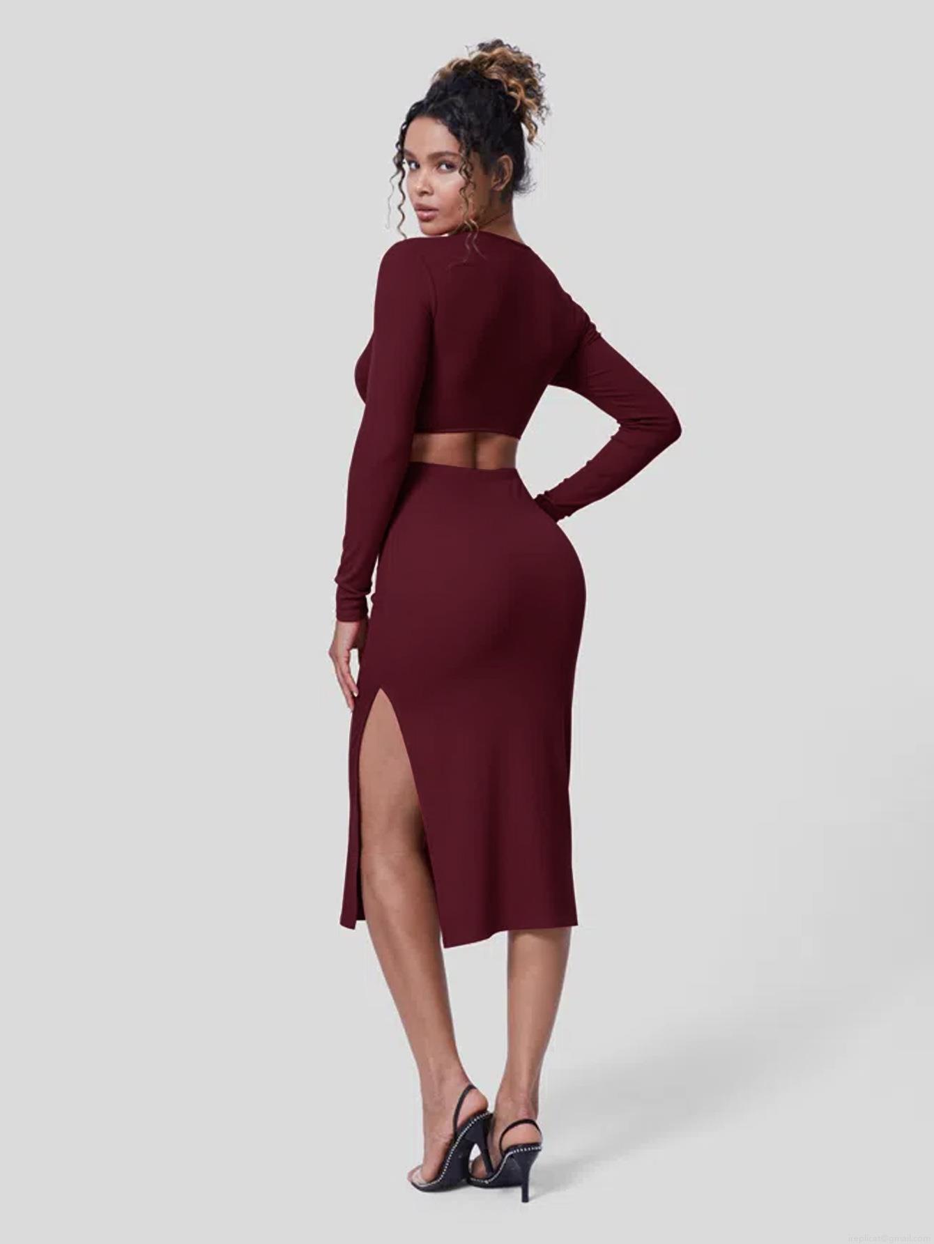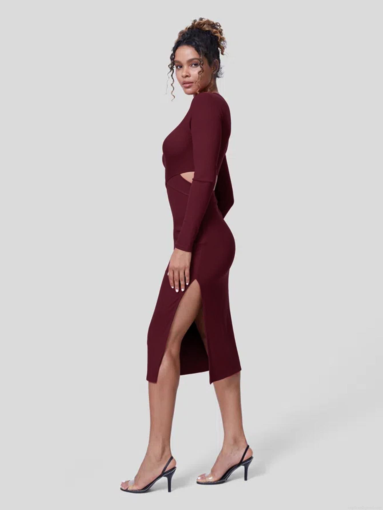 Sexy Wine Red Knit Hollow Out V Neck Midi Dress For Women Long Sleeve Side Split Bodycon Wrap Hip Slim Fit Party Clubwear Elegant Dress