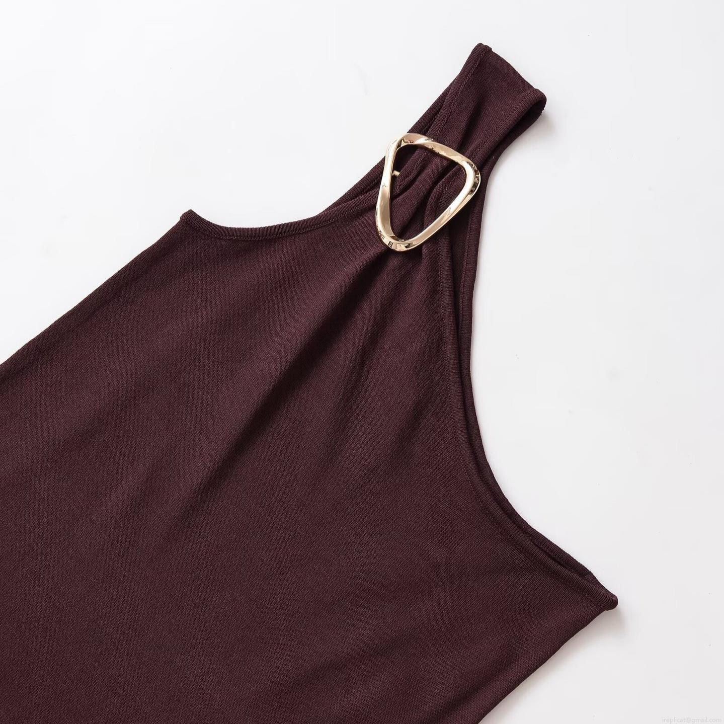 • Sexy Women One Shoulder Ribbed Knit Midi Dress With Gold Metal Buckle Asymmetric Neckline Slim Fit Slit Sleeveless Summer Solid Color Polyester Dress