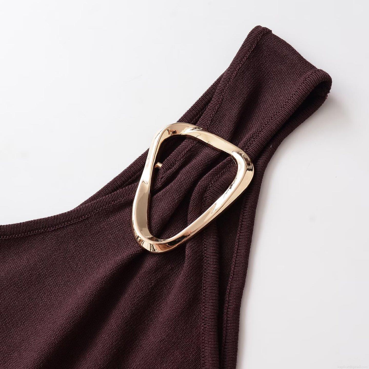 Solid Color, Gold Metal Buckle, Knit Rib, Hem Slit, Asymmetrical Shoulder Cut