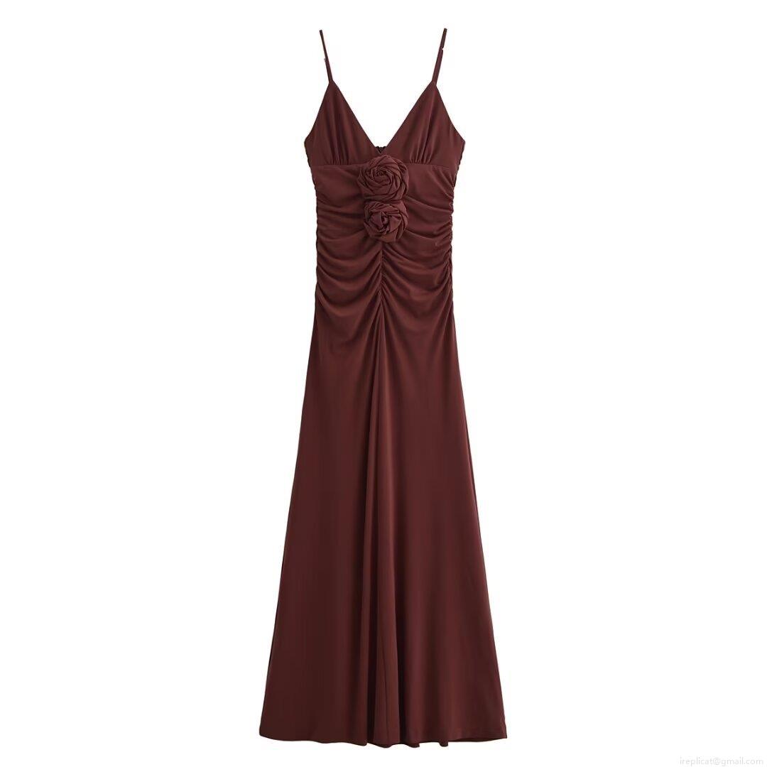 Sexy Women's 3D Rose Flower Spaghetti Strap Midi Dress Ruched V-Neck Slim Fit Evening Party Bodycon Slip Dress Coffee Burgundy Polyester Streetwear Dress