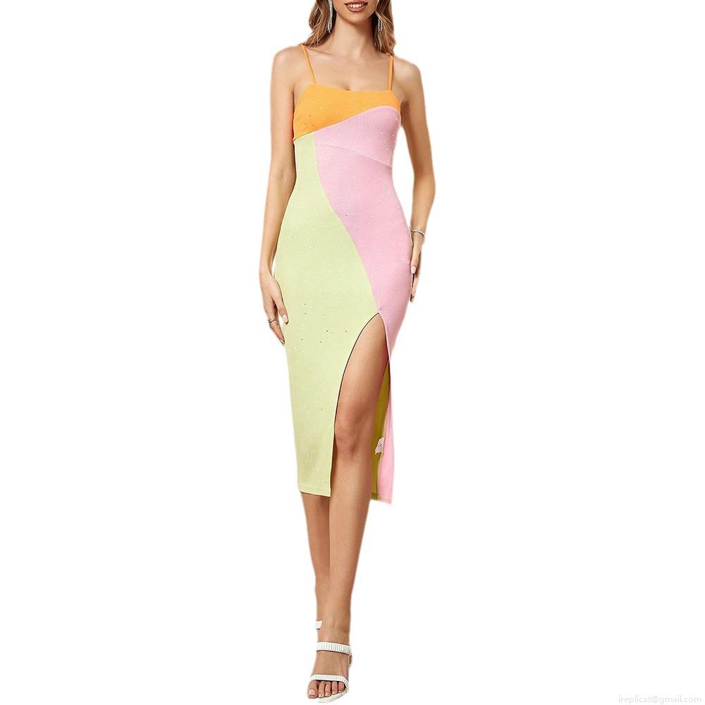 • Sexy Women's Color Block Camisole Dress High Slit Bodycon Midi Dress Sparkly Contrast Patchwork Sleeveless Spaghetti Strap V-Neck Party Vacation Dress