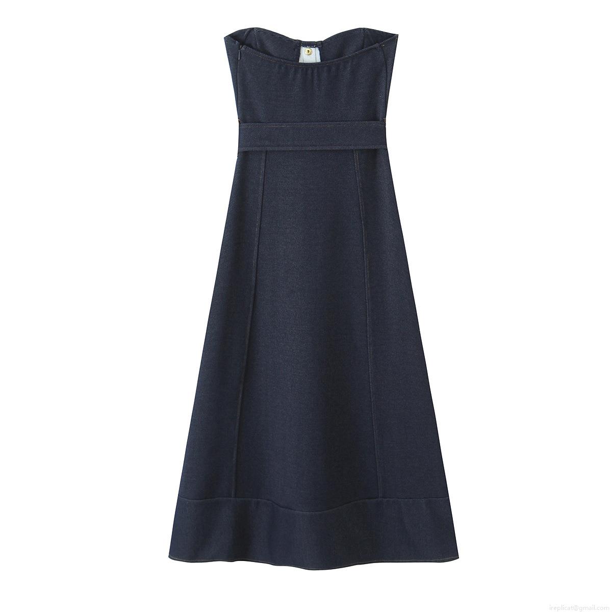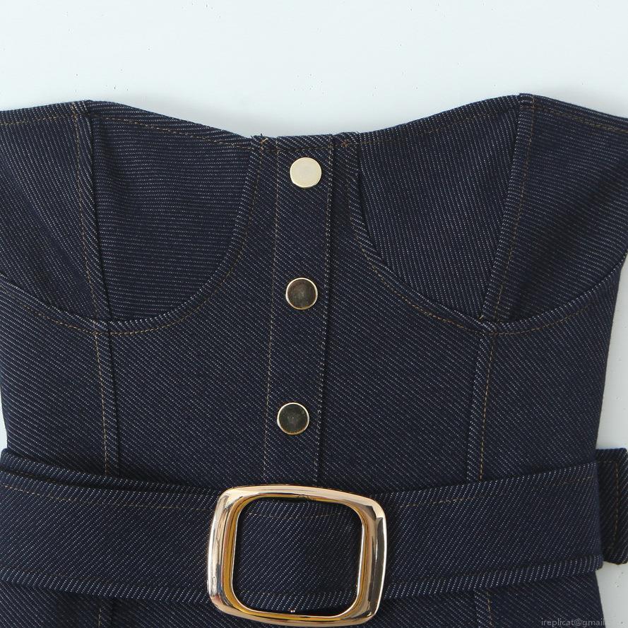• Summer Sexy Dark Blue Denim Strapless Midi Dress With Belt Gold Buttons Slim Fit Bodycon Evening Party Dress For Women