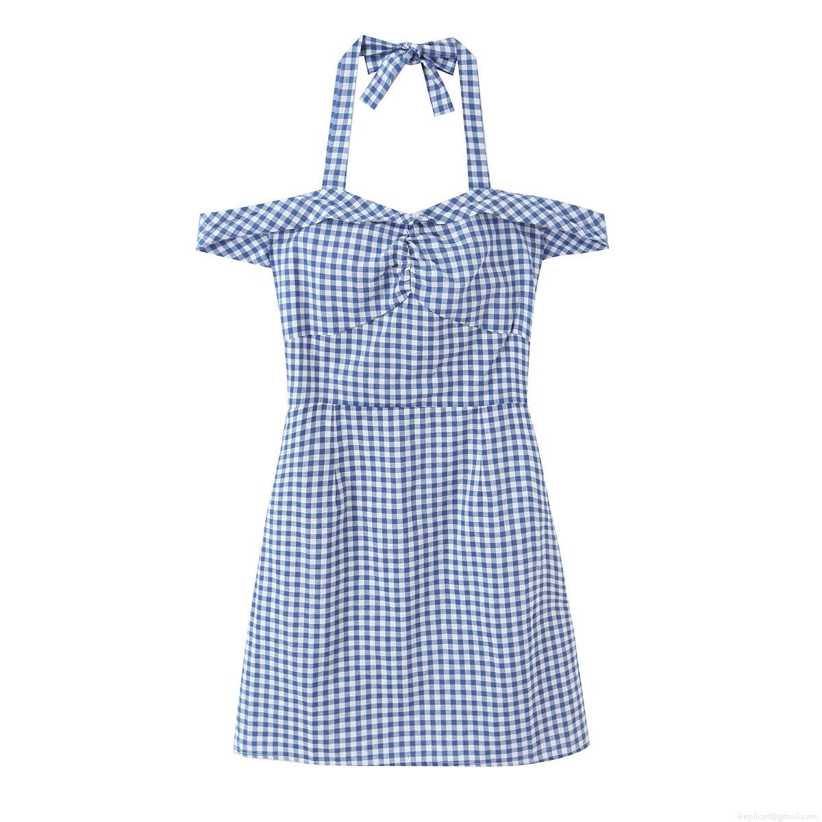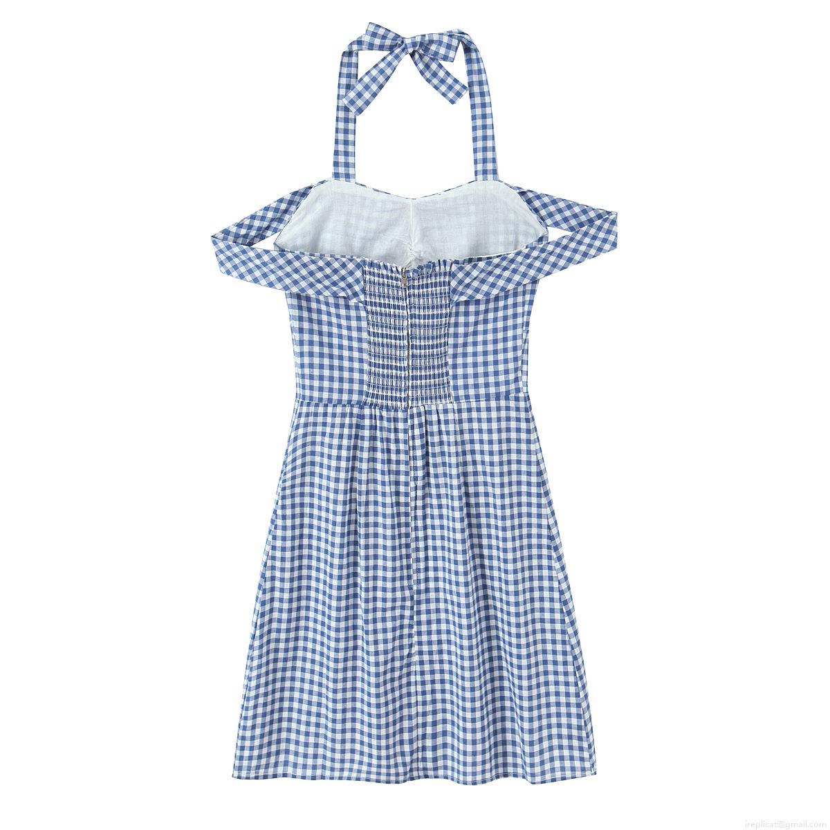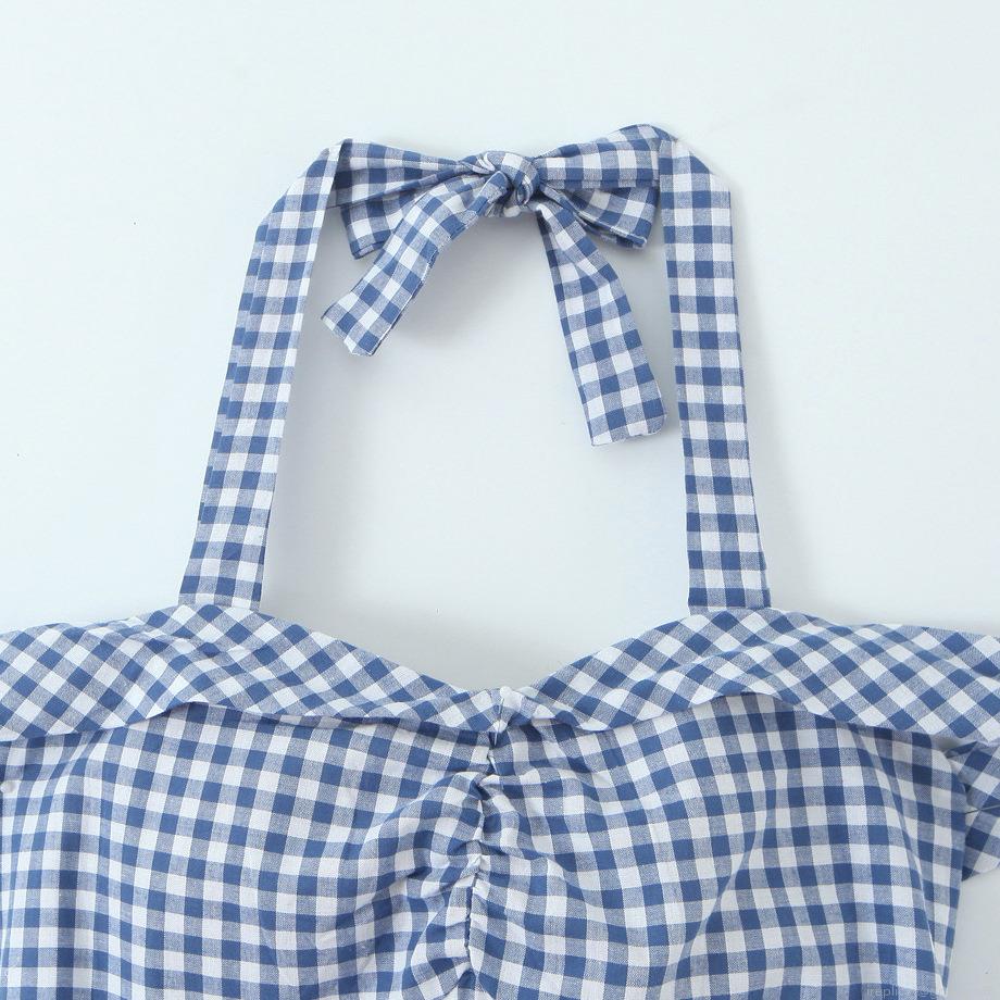 Sweet Blue White Gingham Halter Midi Dress 100% Cotton Bow Tie Off Shoulder Smocked Slim Fit Vacation Sun Dress For Women
