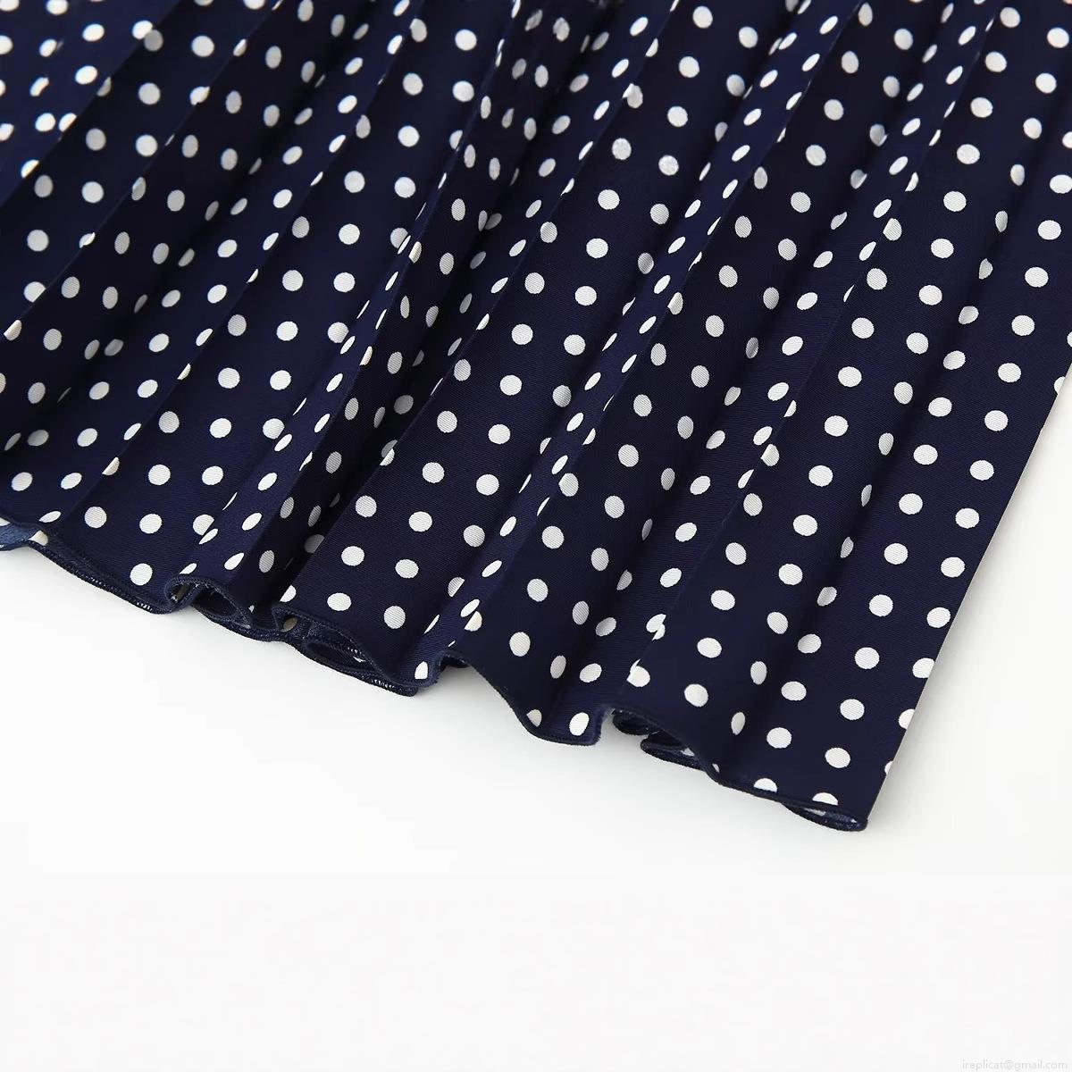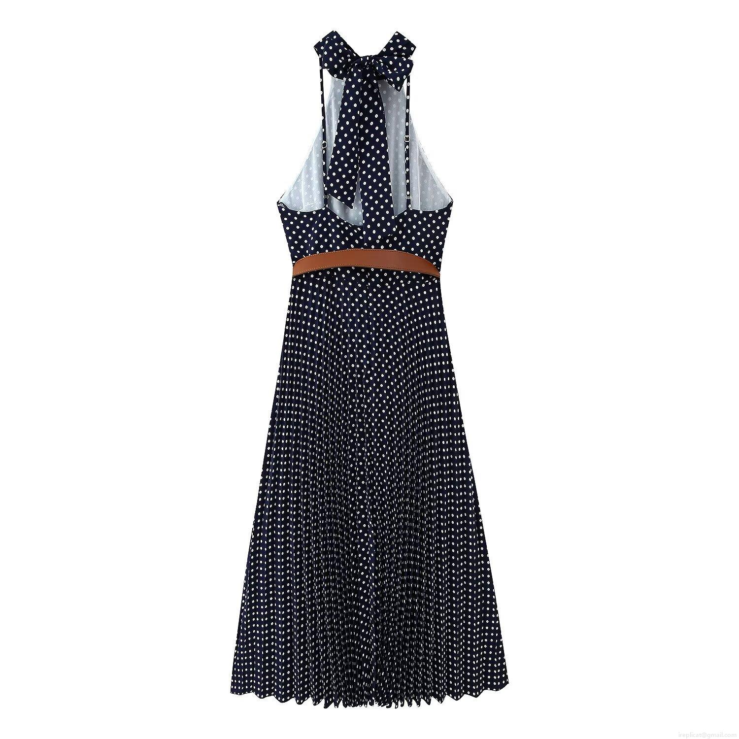 • Vintage Navy Blue White Polka Dot Halter Neck Midi Pleated Dress With Brown Leather Belt Sleeveless Backless Elegant Party Vacation Dress For Women