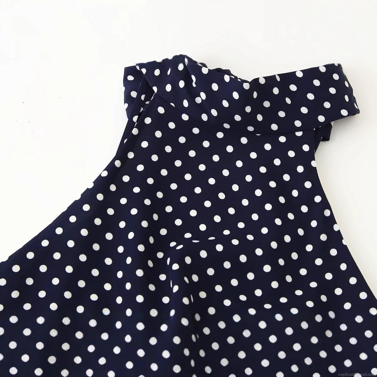 Vintage Navy Blue White Polka Dot Halter Neck Midi Pleated Dress With Brown Leather Belt Sleeveless Backless Elegant Party Vacation Dress For Women