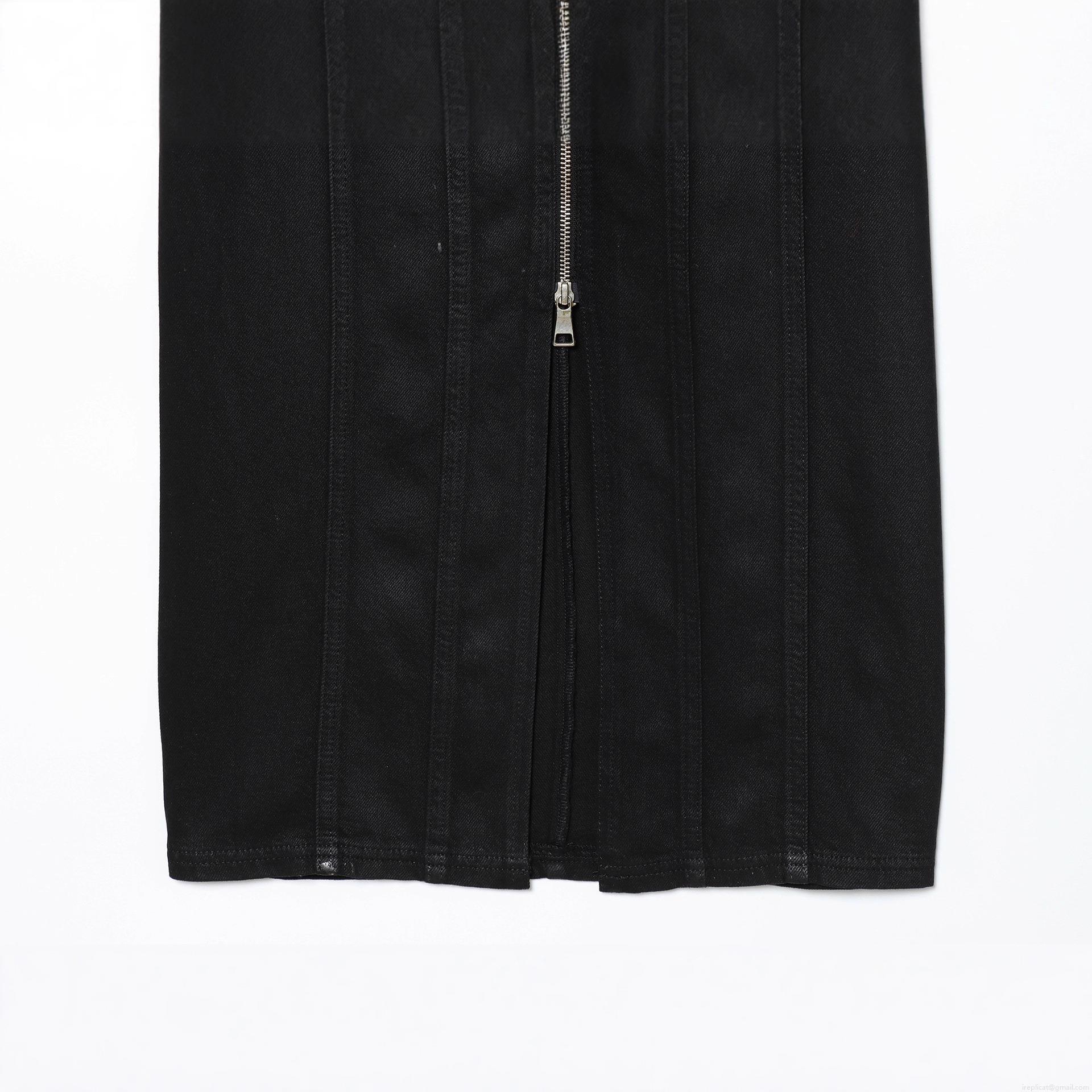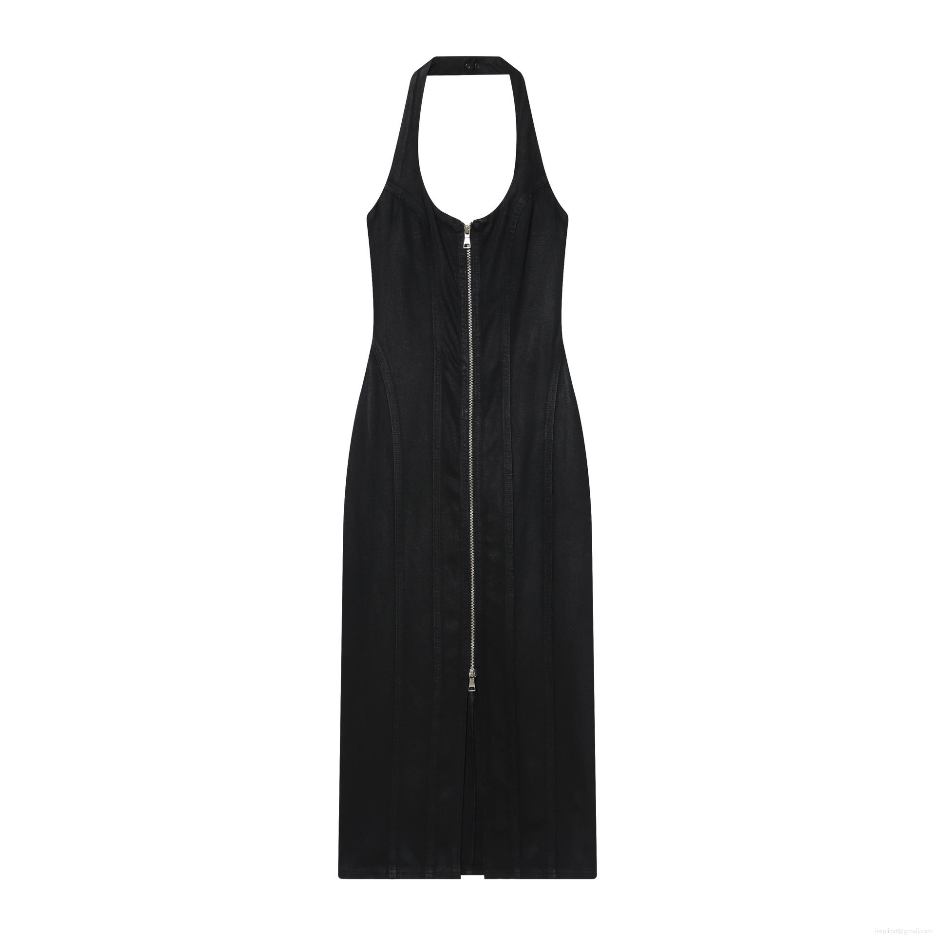 Women Black Halter Denim Bodycon Dress Coated Polyester Slim Fit Backless Midi Dress For Party Elegant Sleeveless Metallic Zipper Clubwear