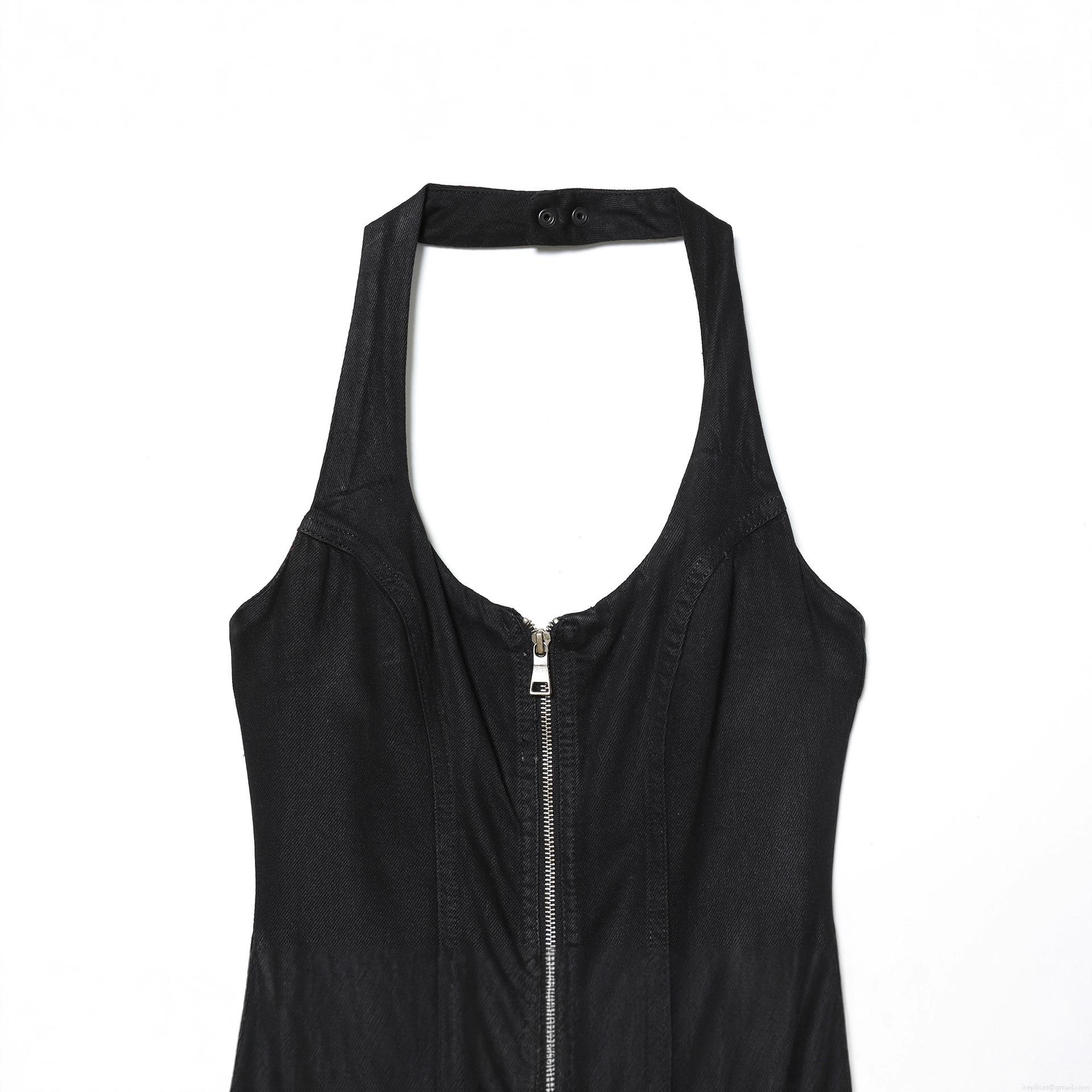 • Women Black Halter Denim Bodycon Dress Coated Polyester Slim Fit Backless Midi Dress For Party Elegant Sleeveless Metallic Zipper Clubwear