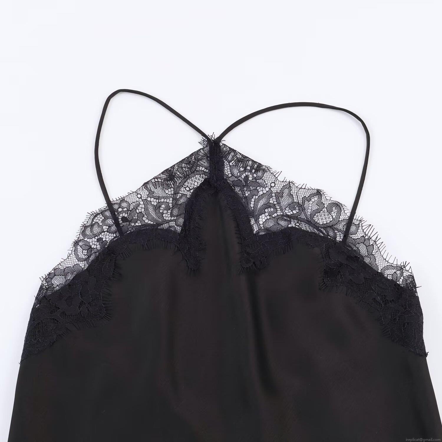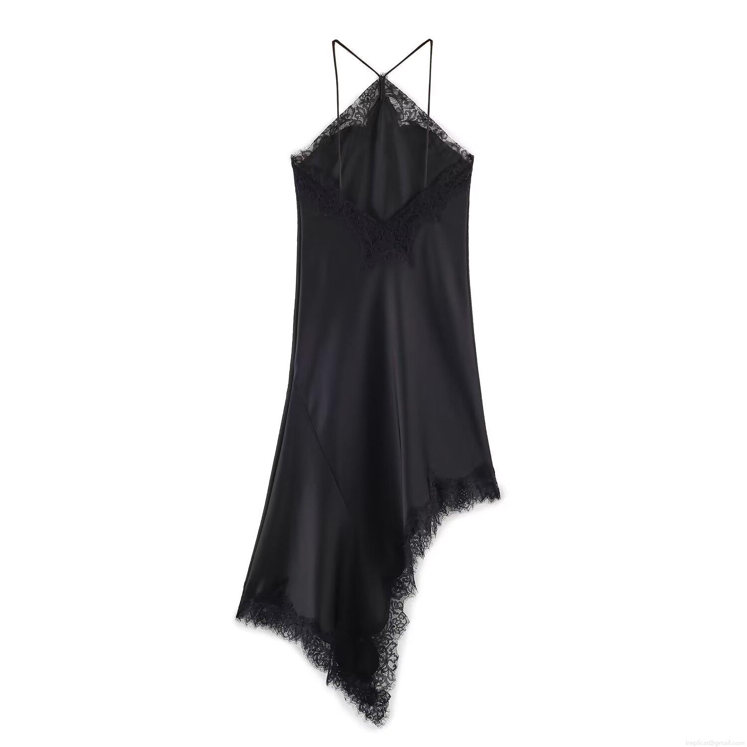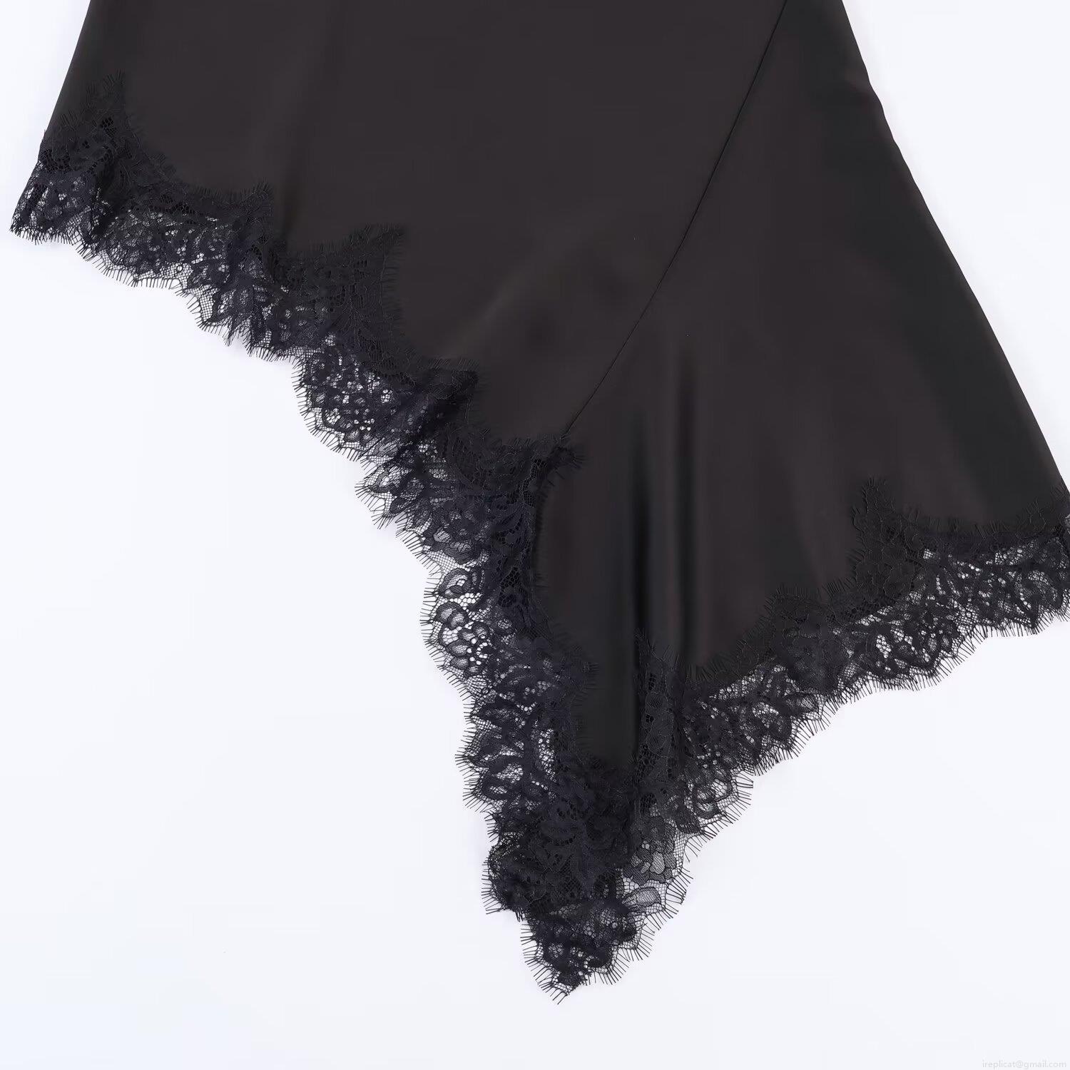 Women Black Satin Slip Dress Lace Patchwork V Neck Asymmetrical Hem Backless Midi Dress Sexy Streetwear Party Evening Cami Dress For Women