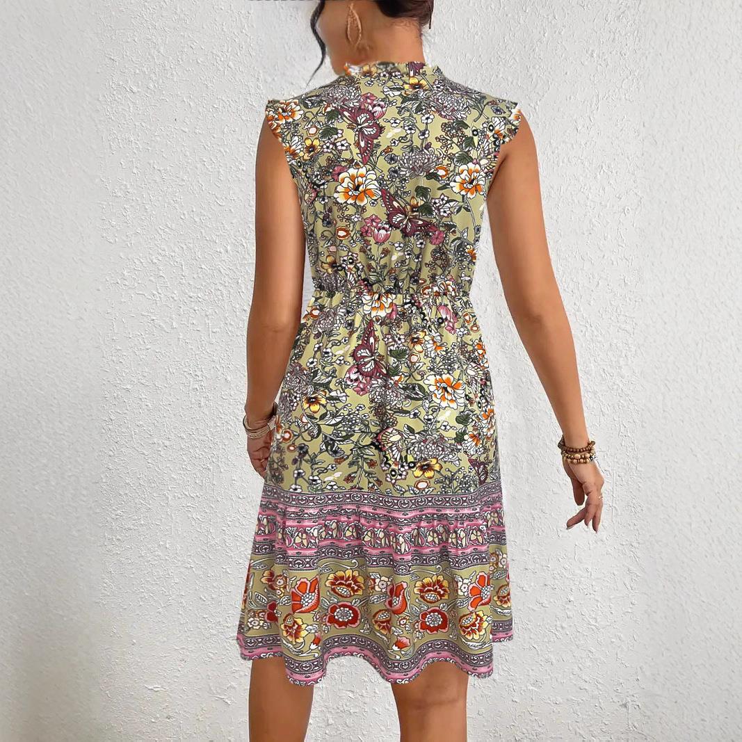 • Women Bohemian Floral Printed Midi Dress V Neck Tie Flutter Sleeve High Waist Elastic A-Line Ruffle Hem Casual Vacation Party Elegant Milk Silk Sundress
