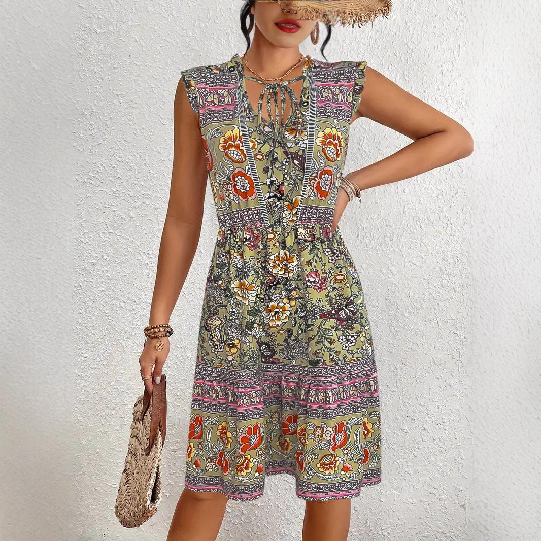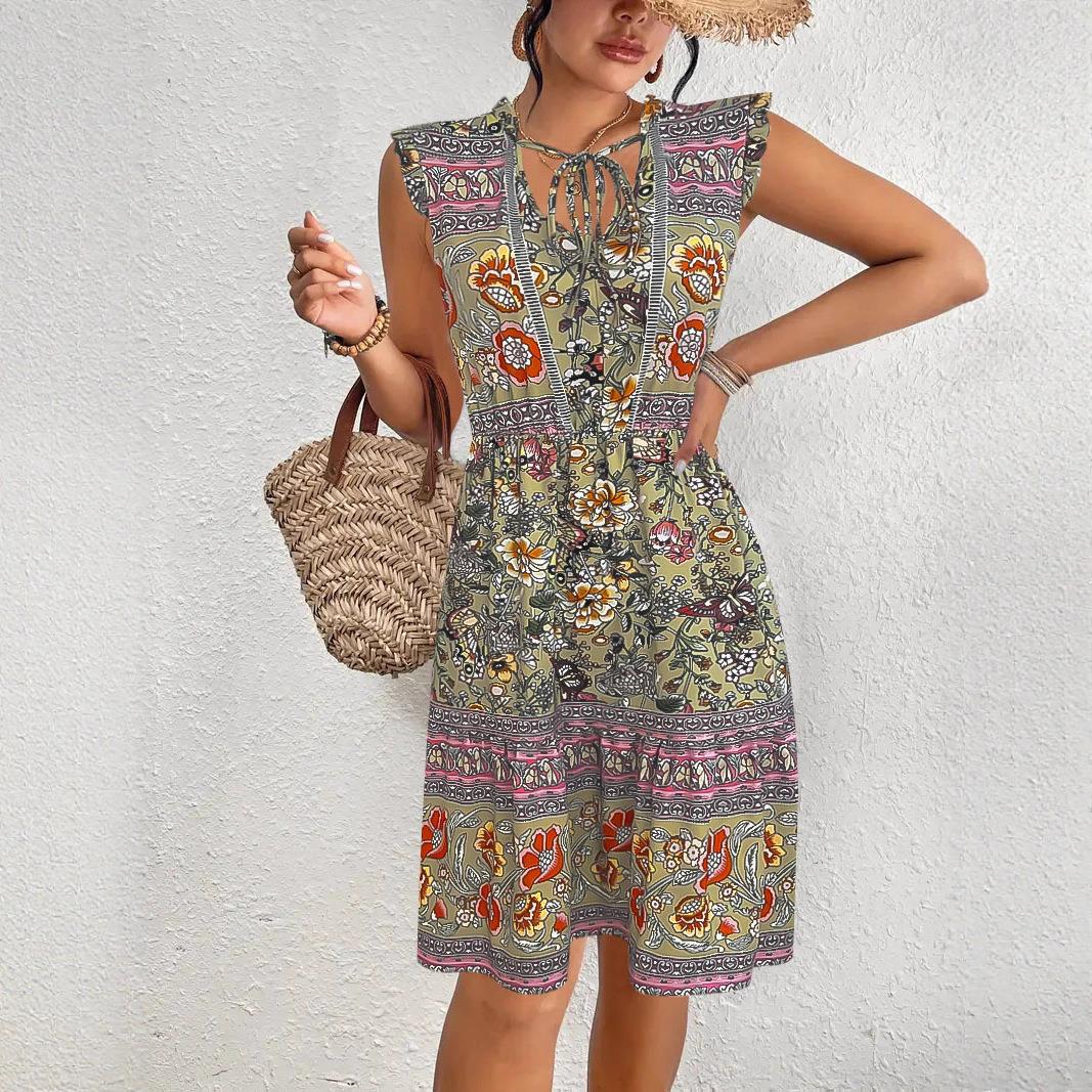 Women Bohemian Floral Printed Midi Dress V Neck Tie Flutter Sleeve High Waist Elastic A-Line Ruffle Hem Casual Vacation Party Elegant Milk Silk Sundress