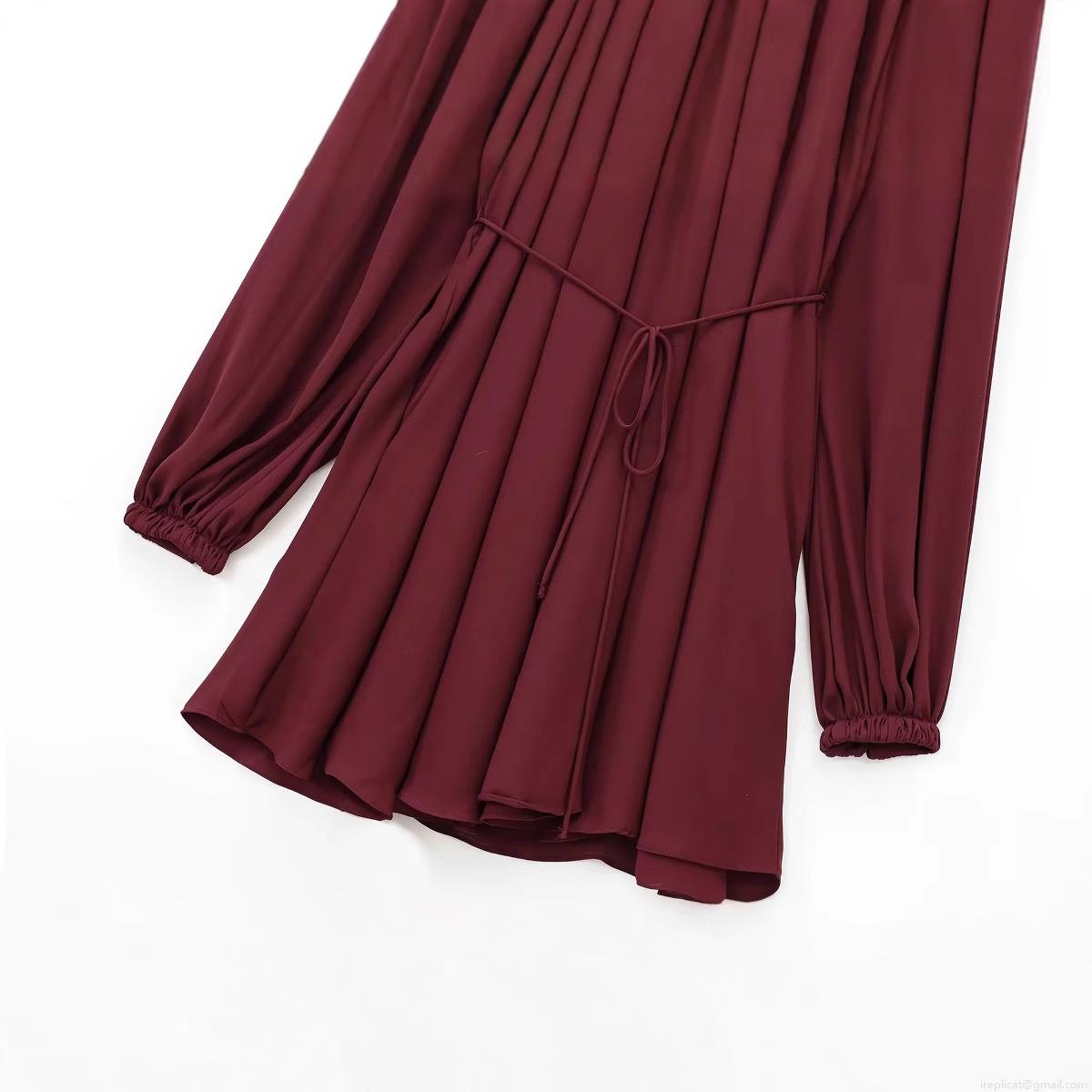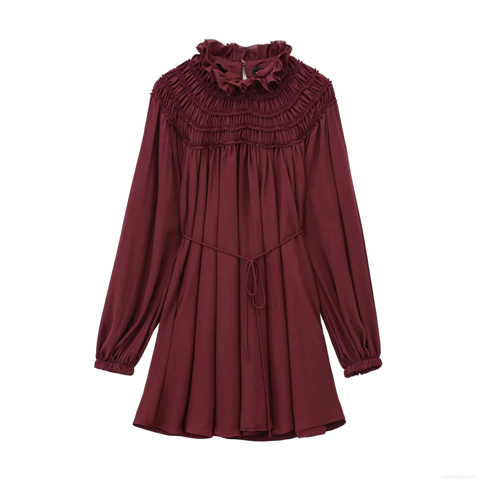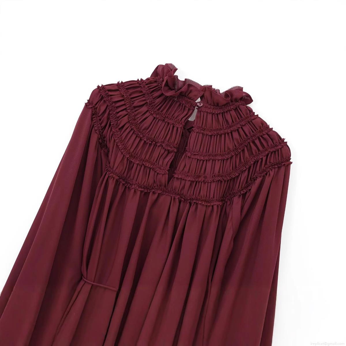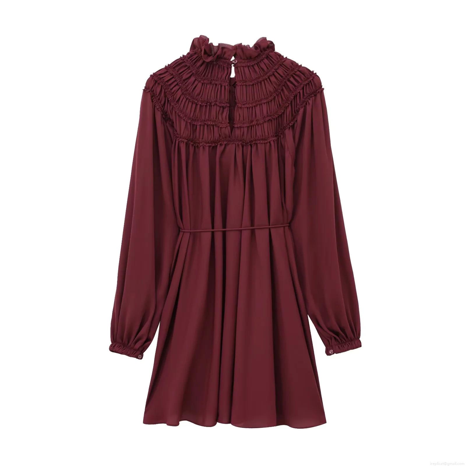 • Women Burgundy Long Sleeve Pleated Maxi Dress Elegant Ruffle Mock Neck Chiffon Dress With Waist Tie Vintage A-Line Party Dress For Lady