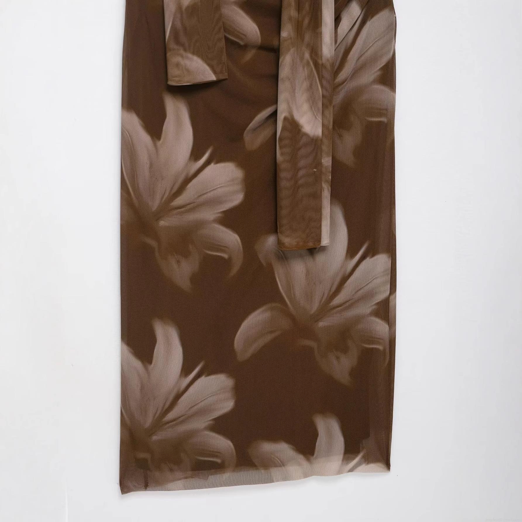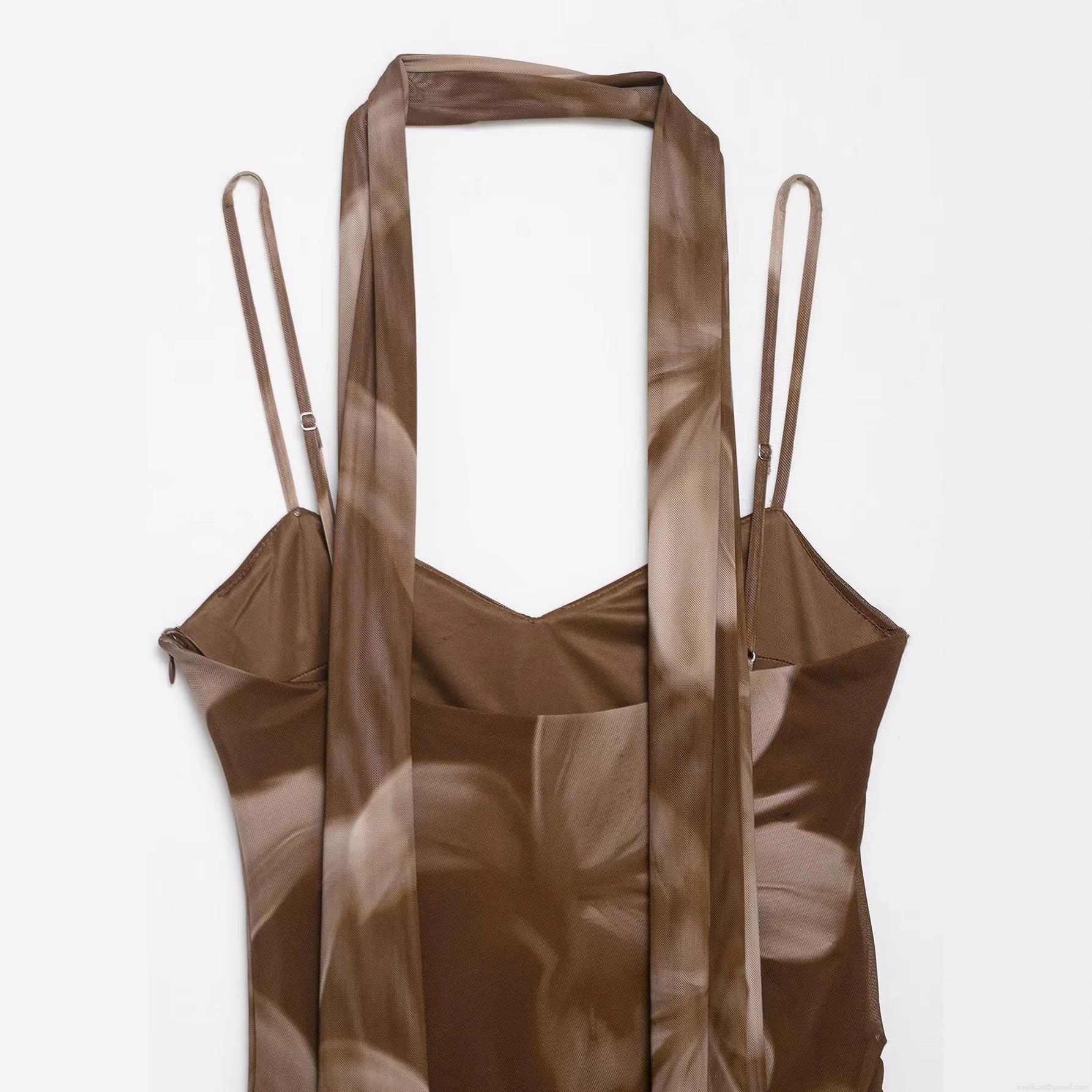 • Women Elegant Brown Floral Print Mesh Midi Dress Sexy Ruched Halter Neck Sleeveless Slim Fit Party Dress With Adjustable Straps