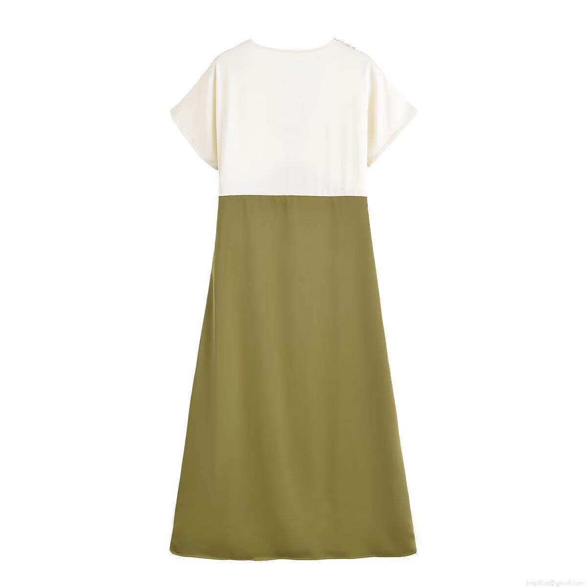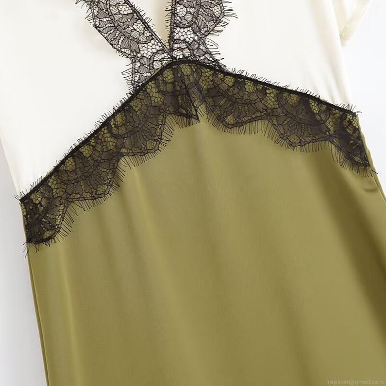 • Women Elegant Color Block Satin Texture Midi Dress Black Lace Trim V-Neck Short Sleeve Patchwork Streetwear Party Dress For Women