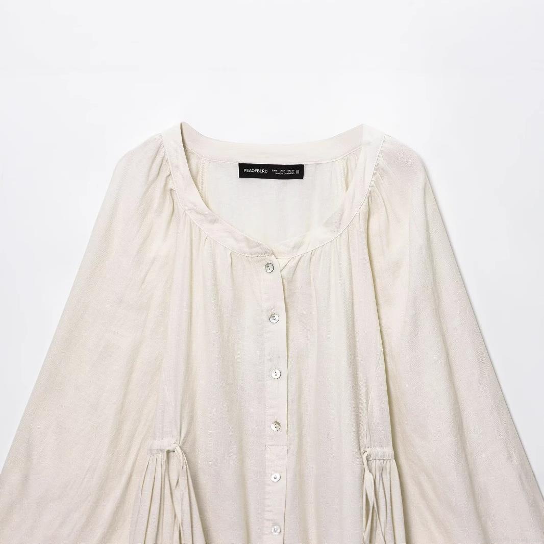 • Women Elegant Cotton Linen Blend Midi Dress Long Sleeve Round Neck Button Down Drawstring Waist Solid Color Casual Fashion Dress for Ladies