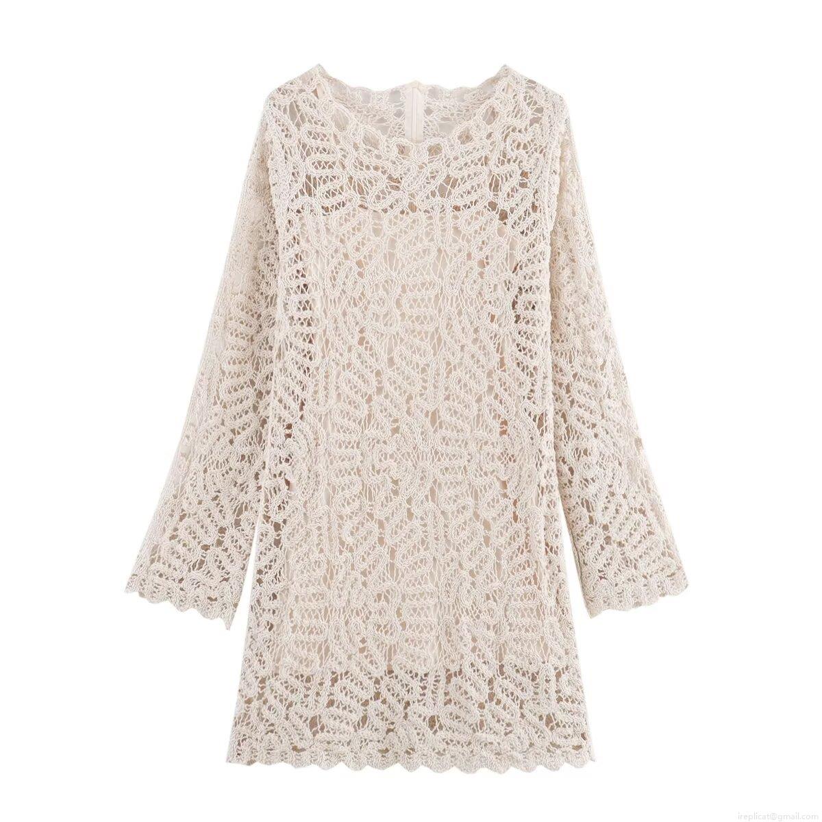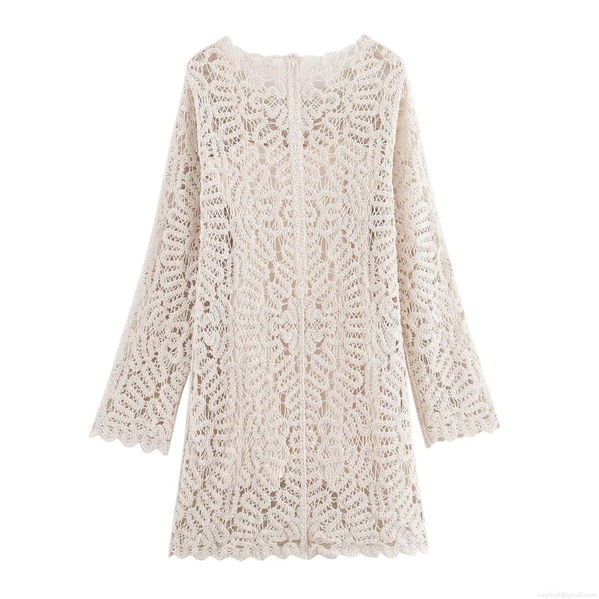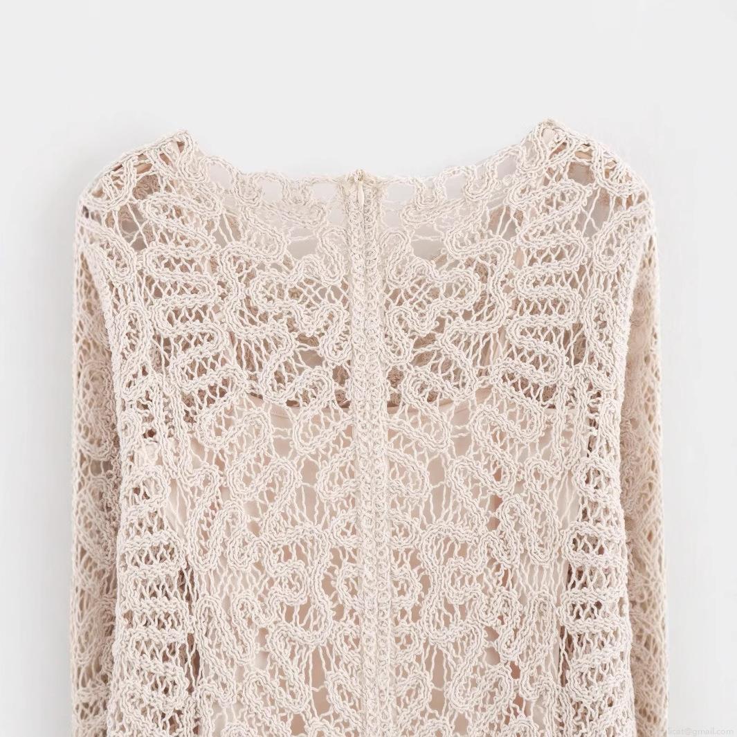 • Women Elegant Crochet Lace Long Sleeve Midi Dress With Inner Slip Hollow Out Split Hem Knitted Dress For Party Evening Celebrity Style Beige Cream