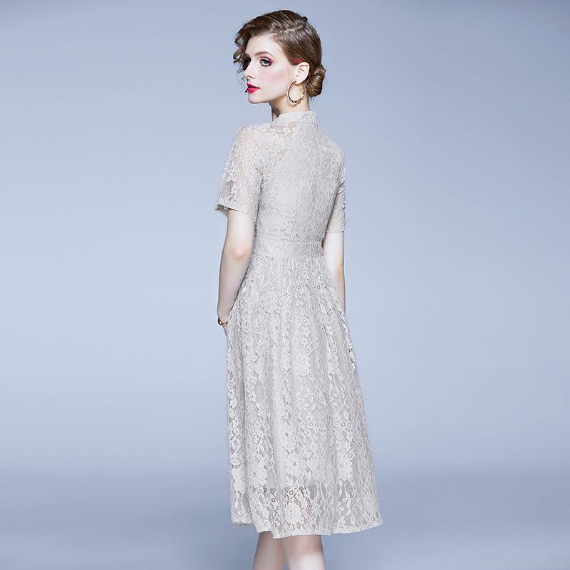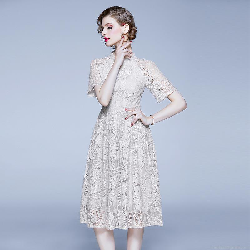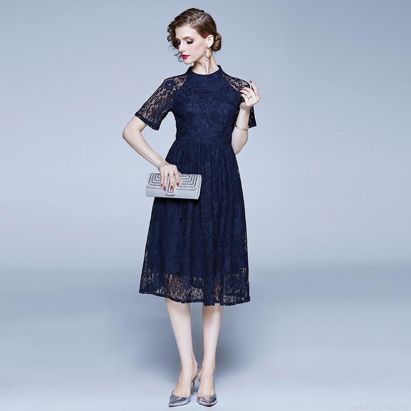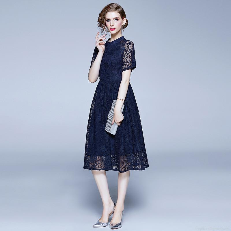 • Women Elegant Floral Lace Midi Dress Round Neck Short Sleeve Slim Fit A-Line Dress For Party Wedding Banquet Formal Evening Ladies Fashion Clothing