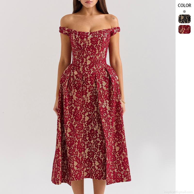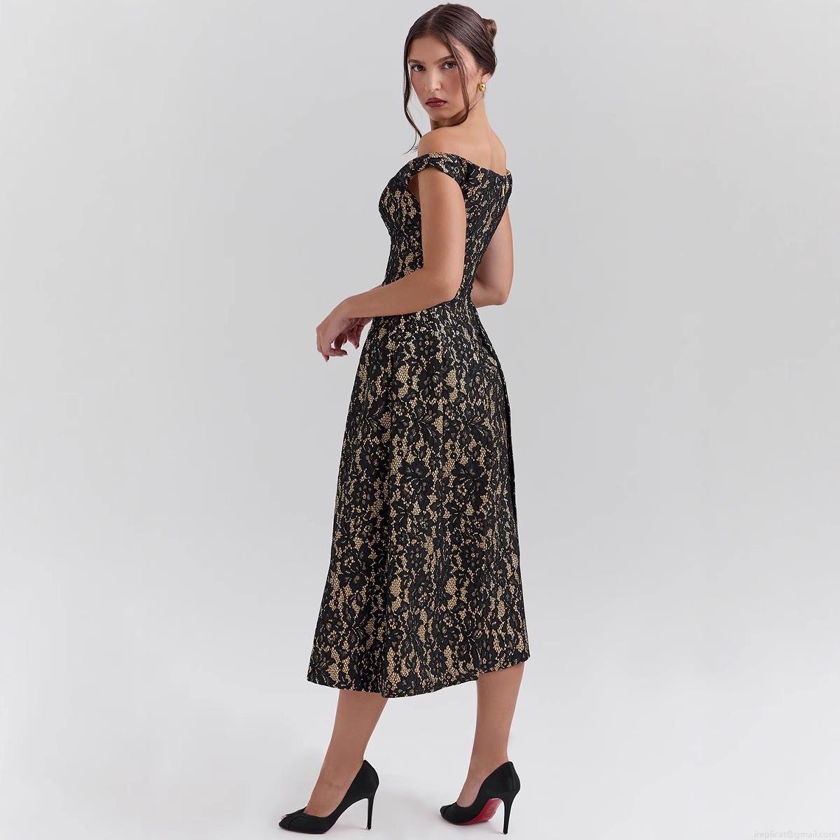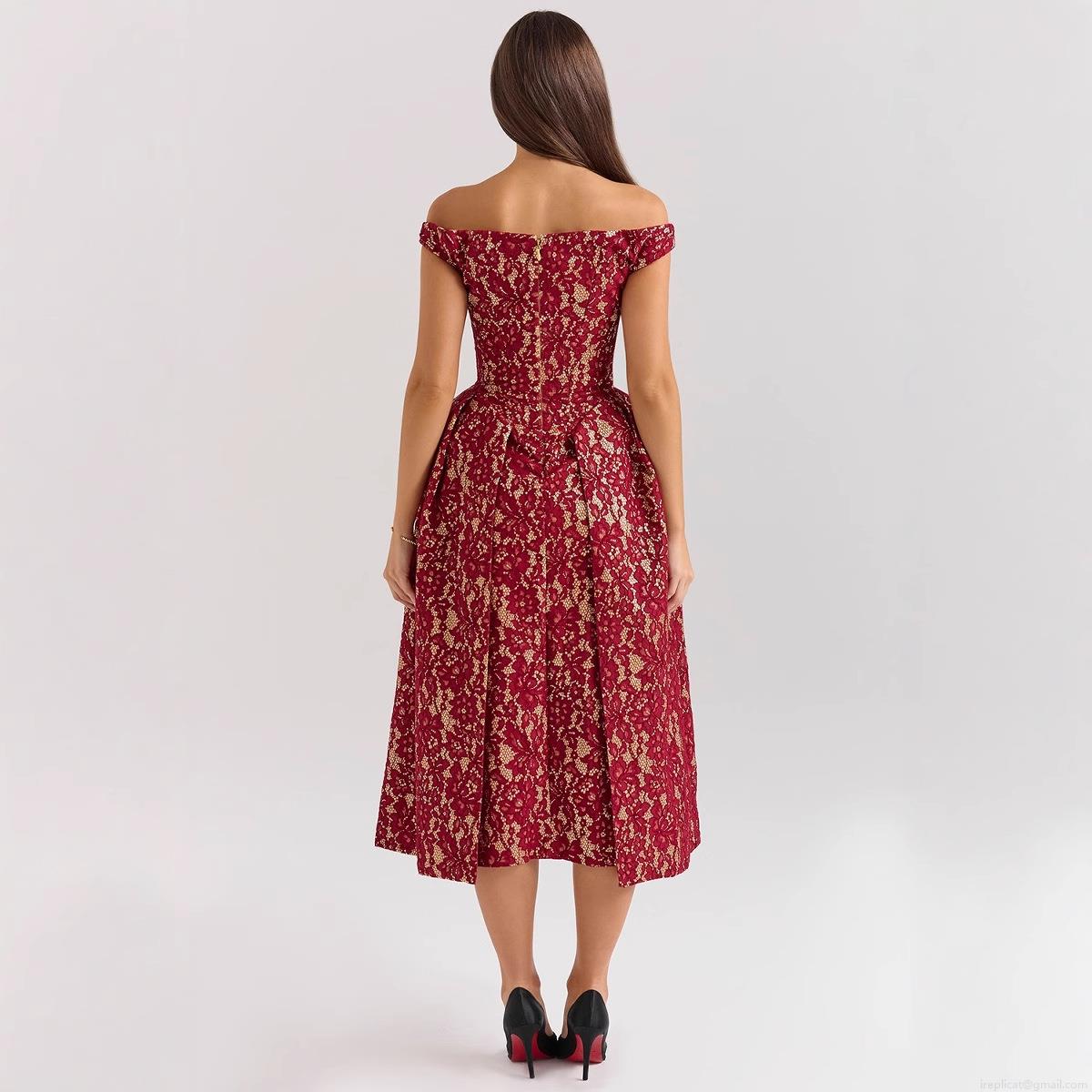 • Women Elegant Floral Lace Off-the-Shoulder Midi Dress Backless Slim Fit High Waist A-Line Party Cocktail Dress For Wedding Party