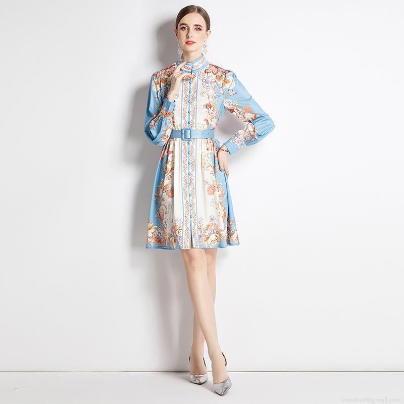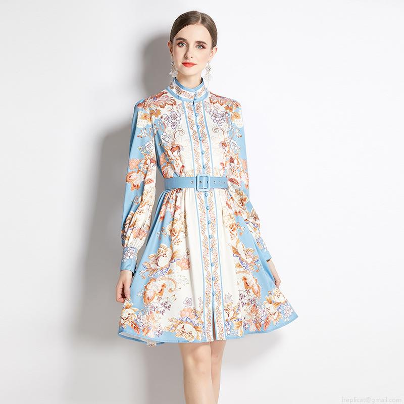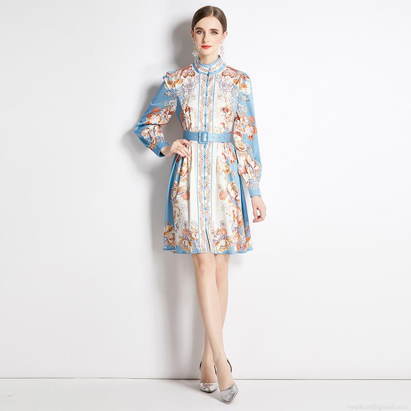 • Women Elegant Floral Printed Midi Dress Stand Collar Long Sleeve Single Breasted A-Line Dress With Belt Vintage Slim Fit Polyester Clothing For Office Daily Autumn Spring