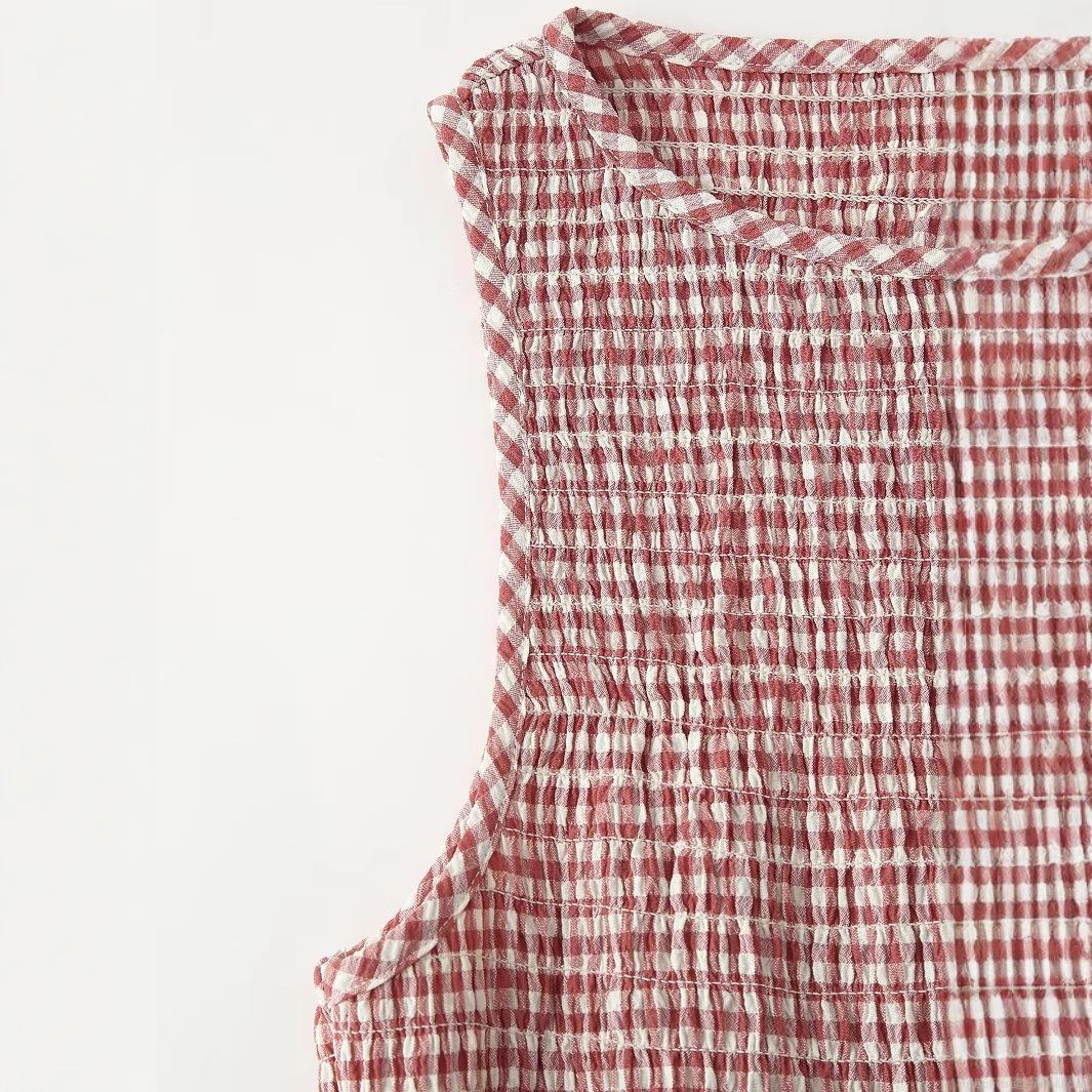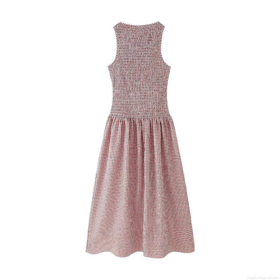 • Women Elegant Gingham Smocked Midi Dress Sleeveless Round Neck Plaid A-Line Summer Vacation Sundress With 100% Polyester Woven Fabric