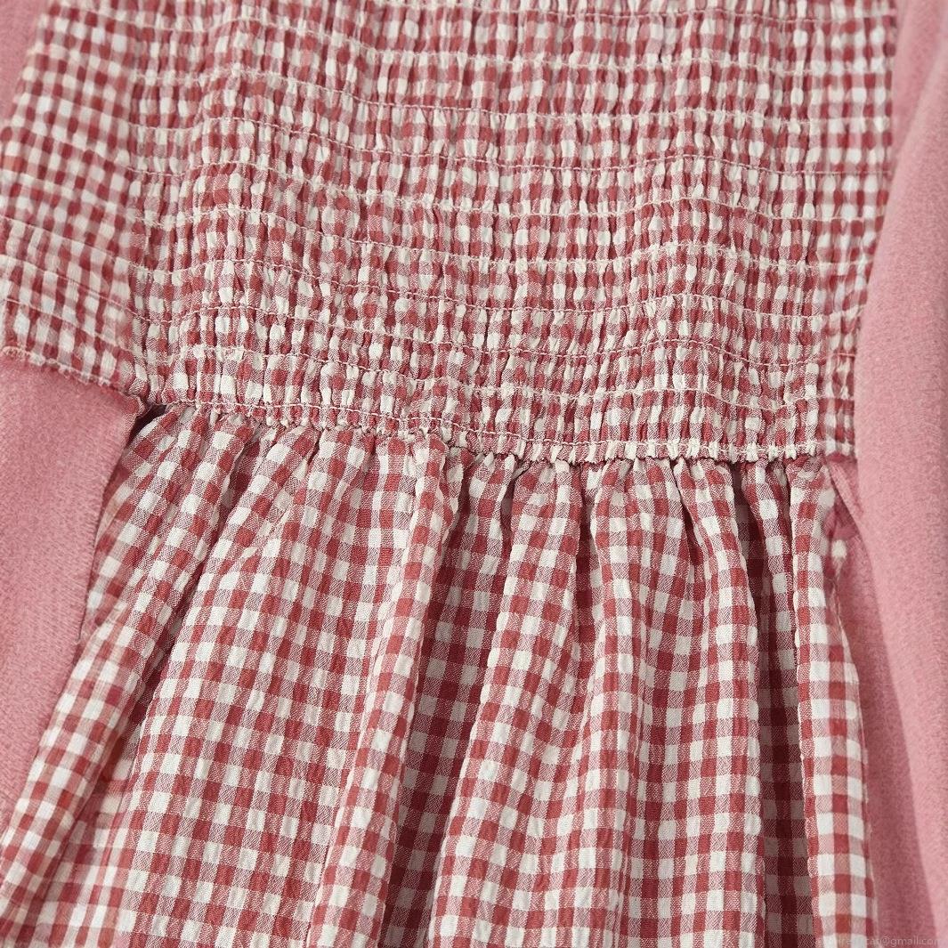 Checkered Pattern, Slab, Crew Neck, Vichy Check, Elastic Pleats, A-line Skirt