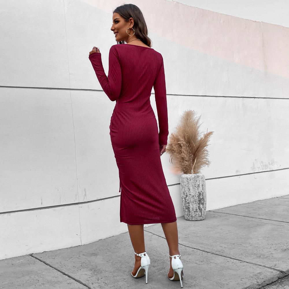 • Women Elegant Knitted Long Sleeve Midi Dress Square Neck Ribbed Solid Burgundy Side Drawstring High Slit Slim Fit Dress for Party Commute