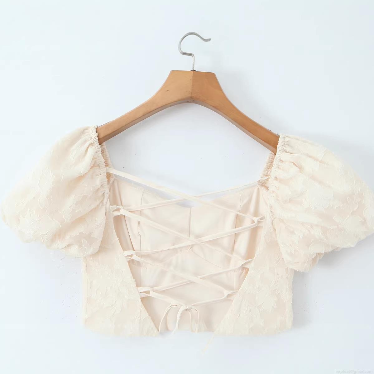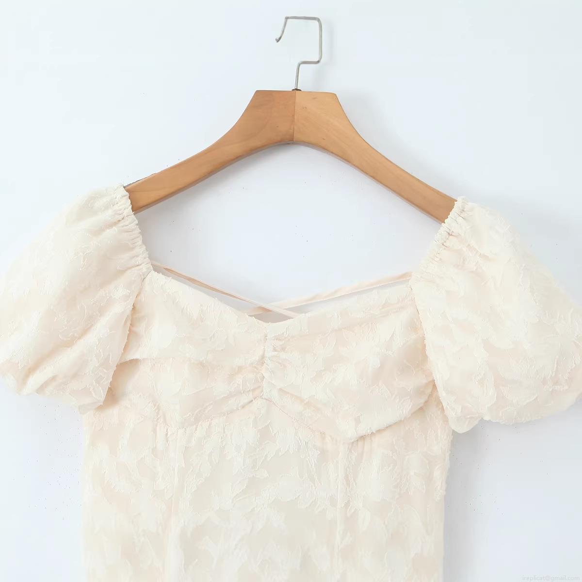 • Women Elegant Lace Jacquard Midi Dress Square Neck Puff Sleeve Open Back Cross Tie-Up Summer Fashion Slim Fit Polyester A-Line Dress