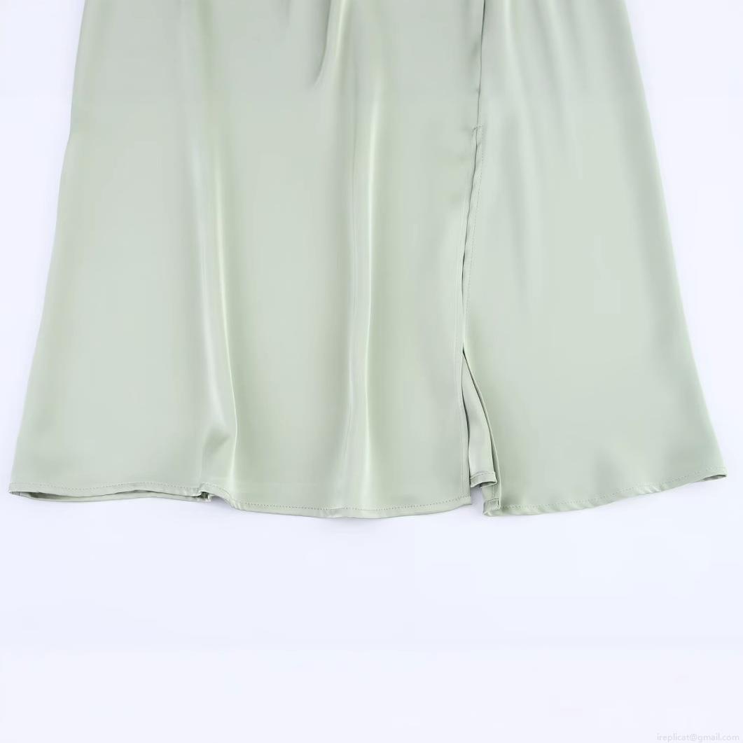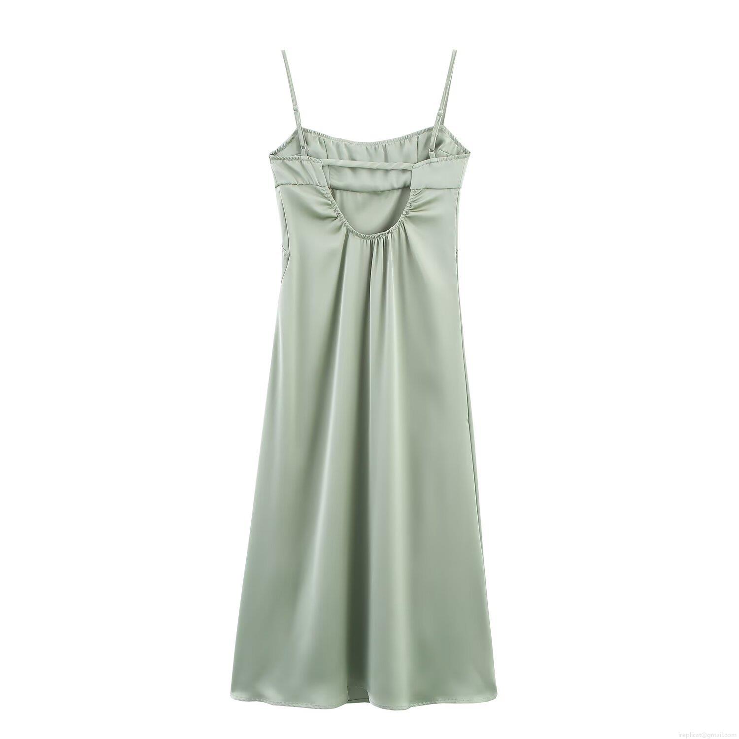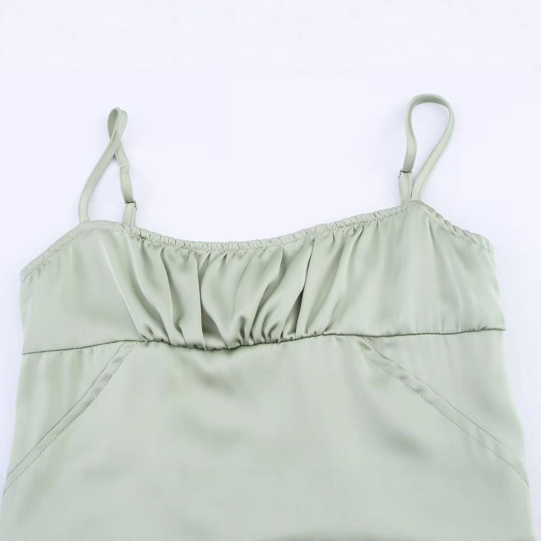 • Women Elegant Light Green Satin Cami Dress With Side Slit Ruching Adjustable Straps Open Back Midi Long Slip Dress For Party Wedding Guest Vacation
