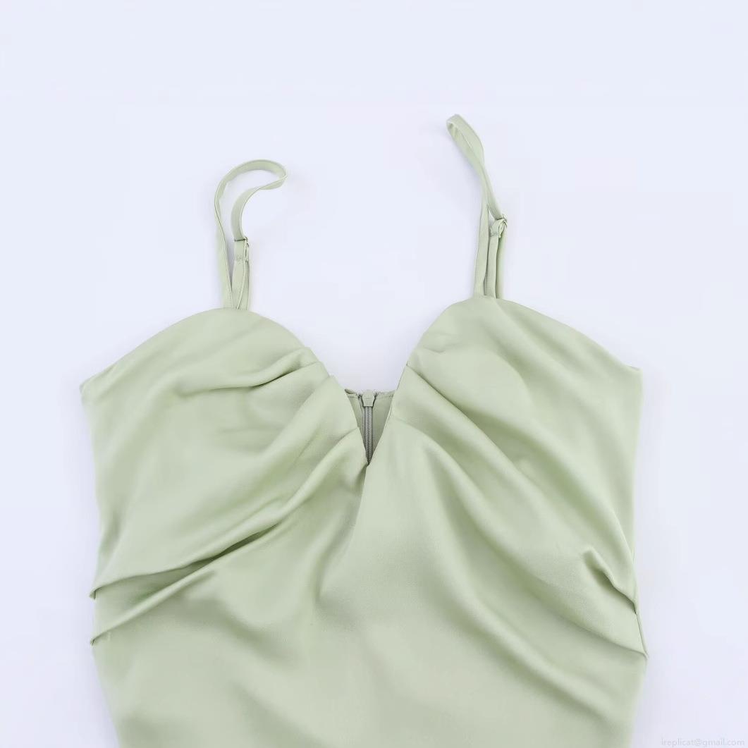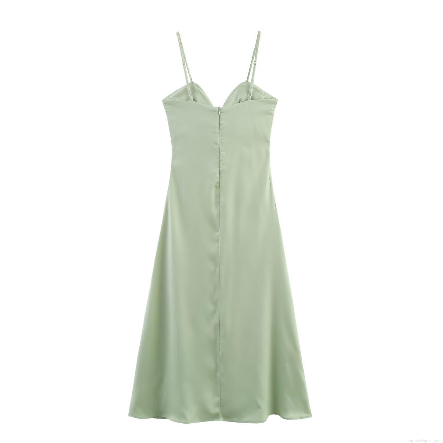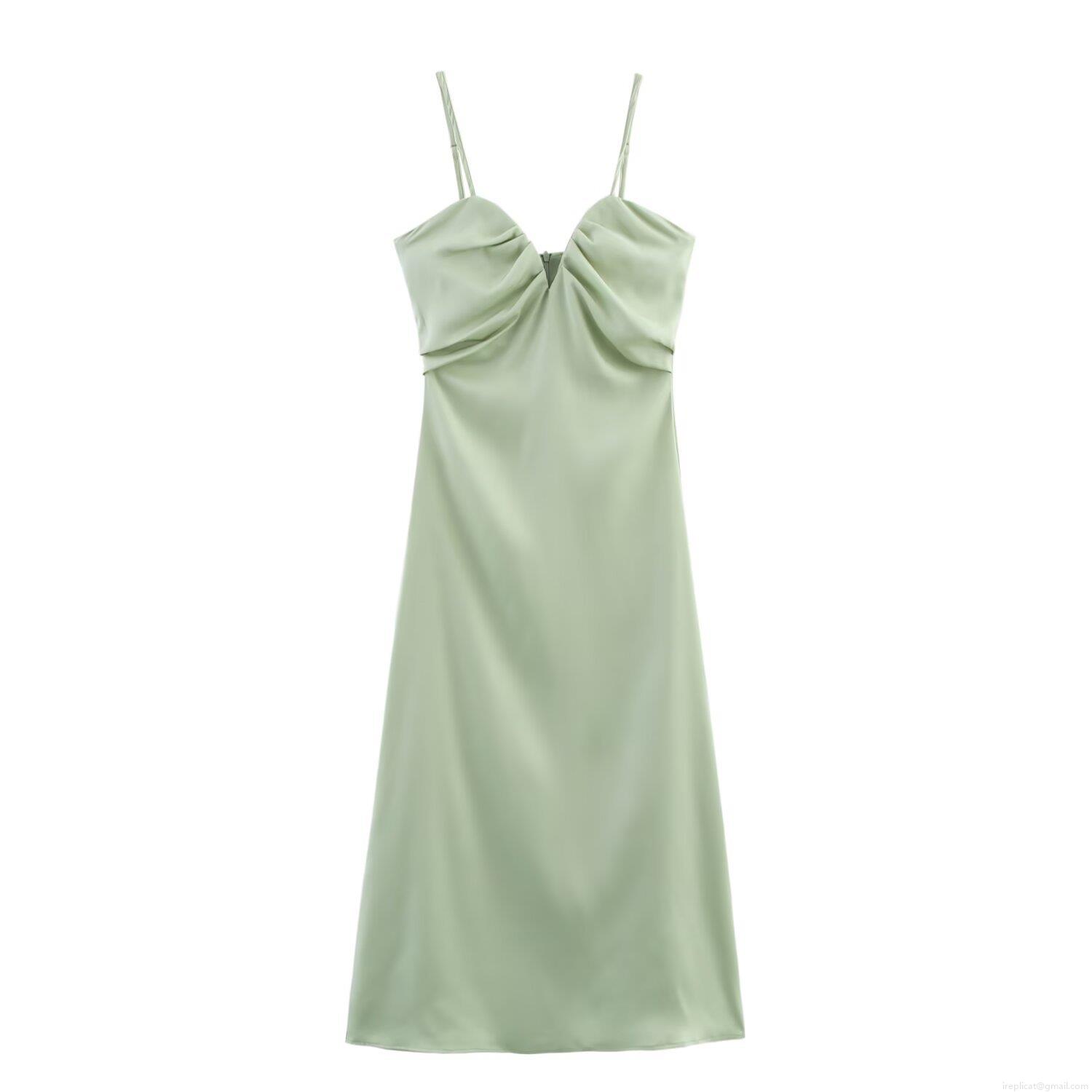 • Women Elegant Mint Green Satin Midi Slip Dress With V-Neck Ruched Bust Adjustable Spaghetti Straps Back Zipper Silk Feel Drape A-Line Party Wedding Guest Socialite Evening Dress