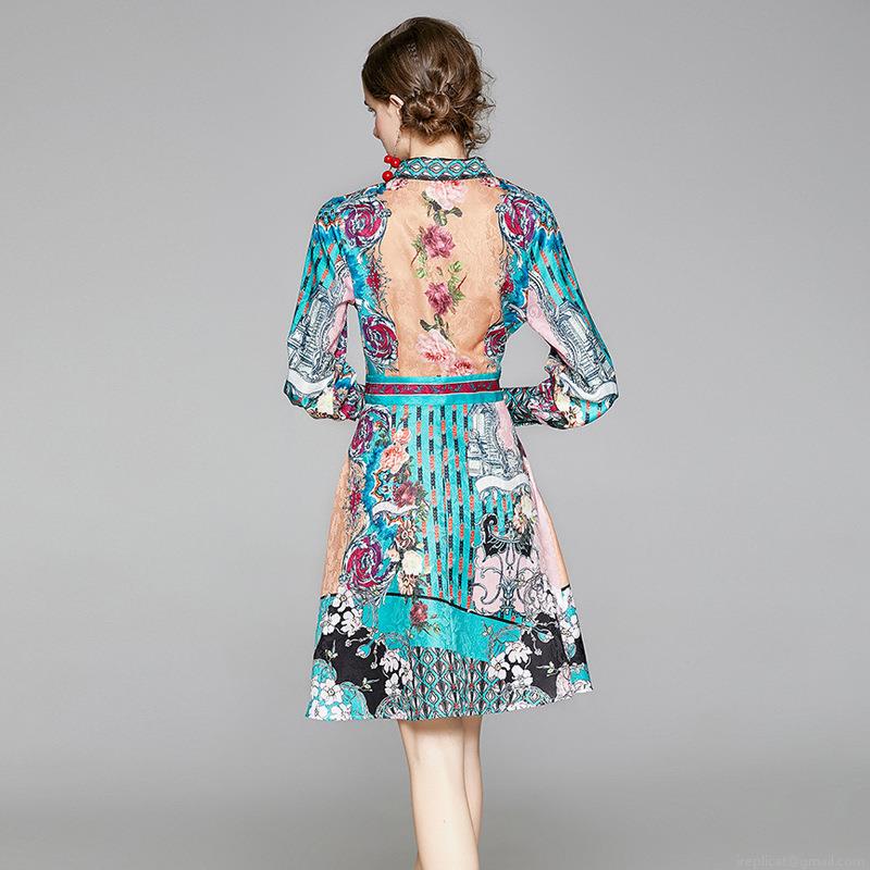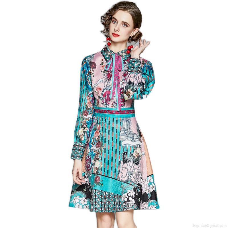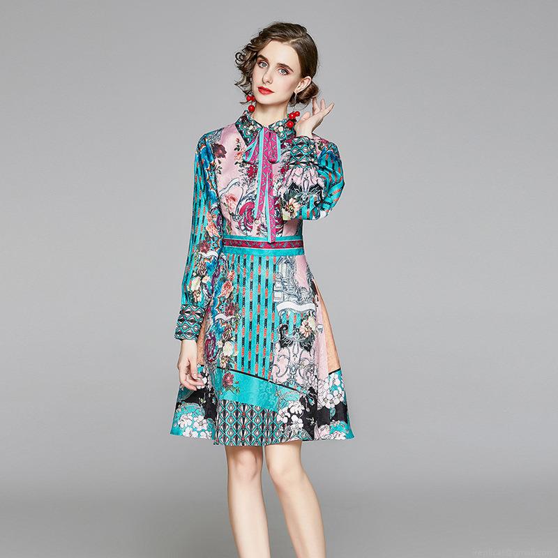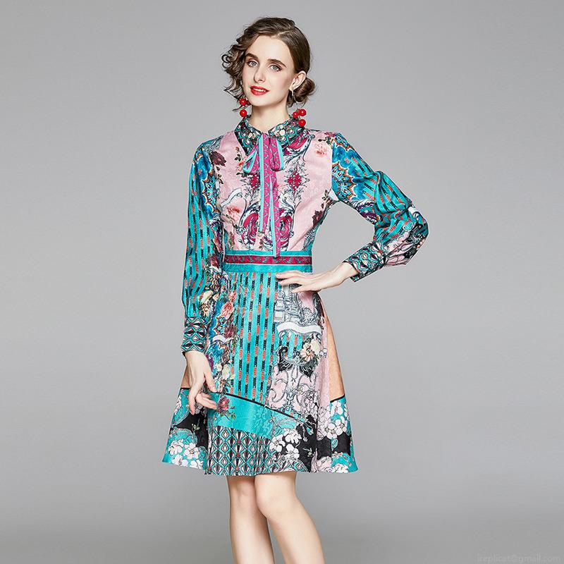 • Women Elegant Multicolored Print Long Sleeve Lapel Bow Tie Shirt Dress Polyester A-Line Midi Dress For Office Casual Floral Geometric Dress Lady