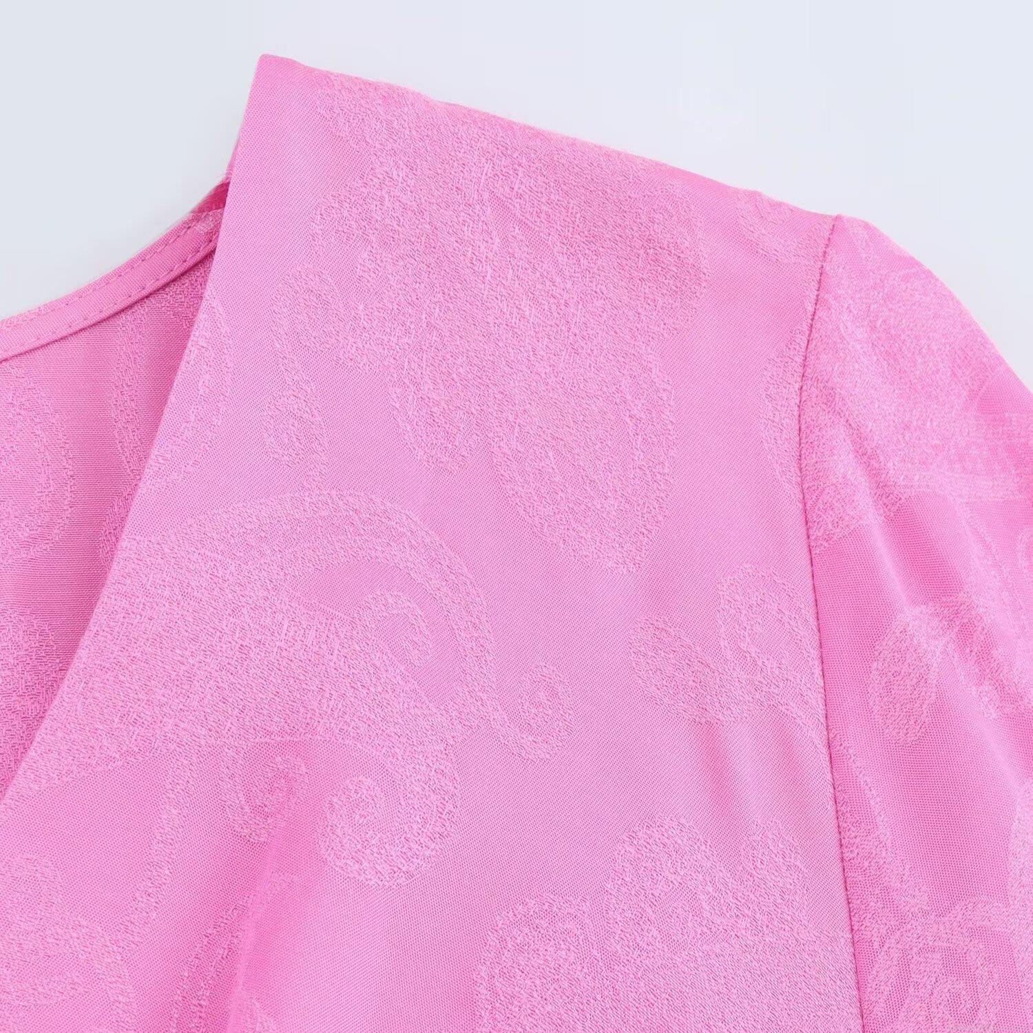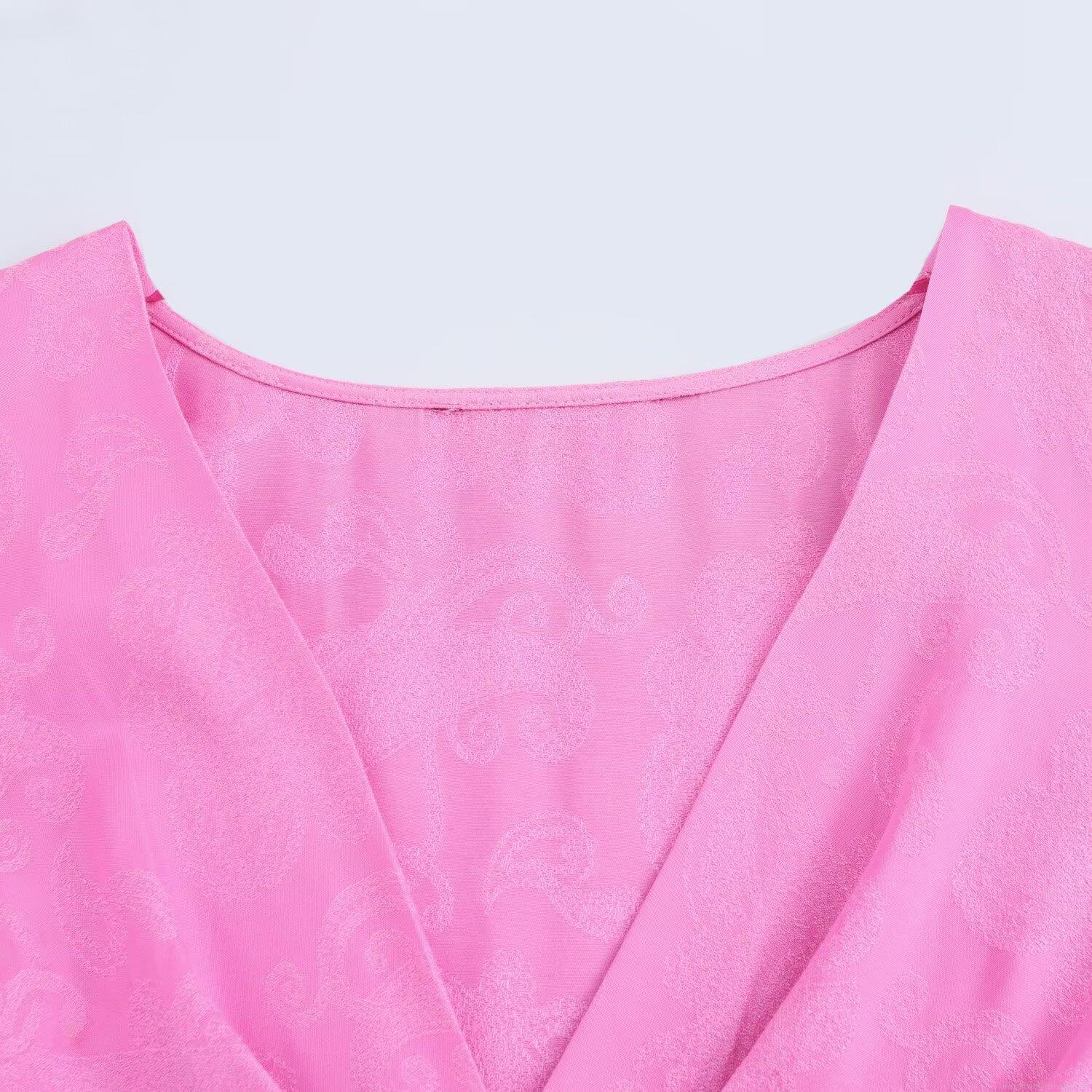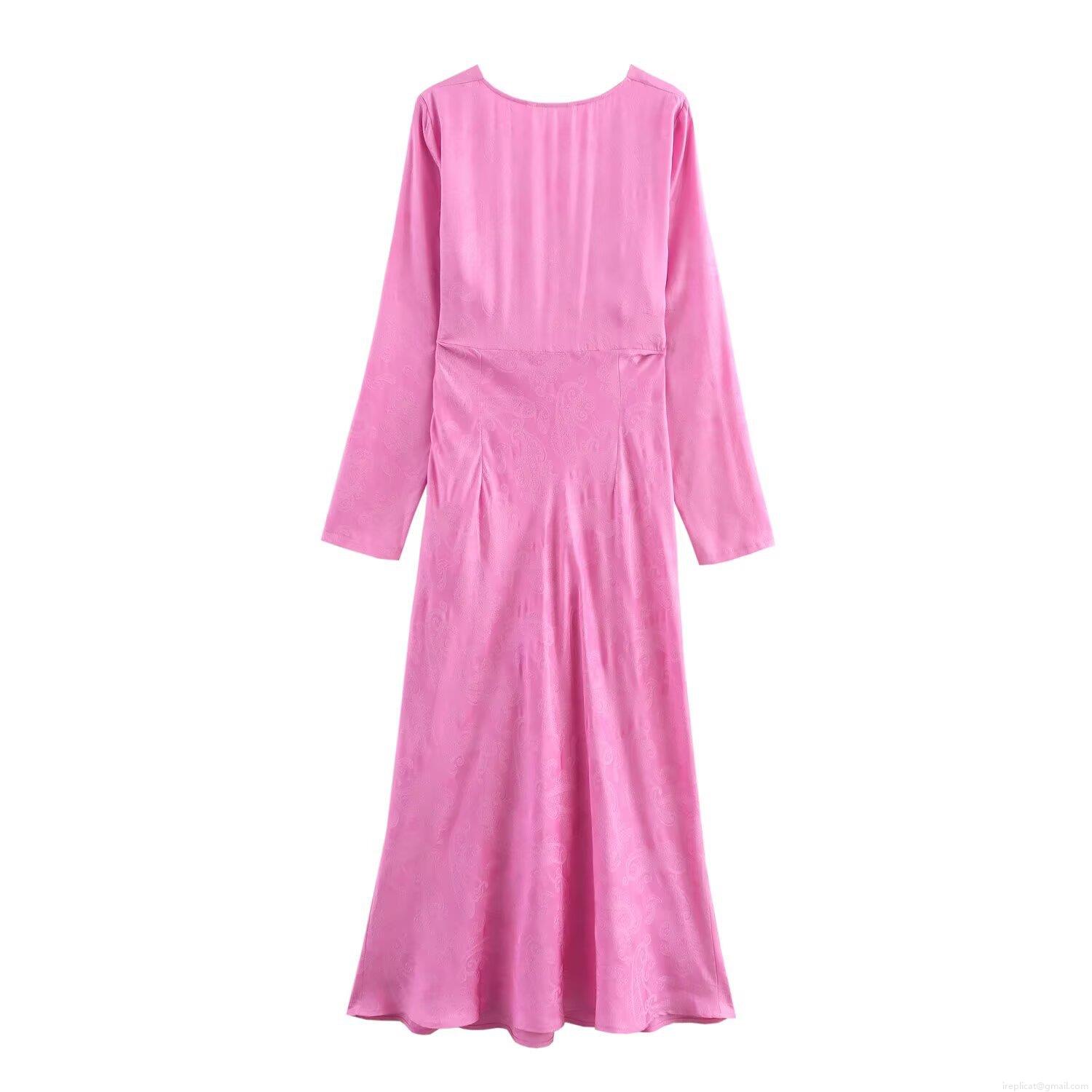 • Women Elegant Pink Jacquard Satin V-Neck Midi Dress Long Sleeve A-Line Formal Party Gown European Fashion Streetwear Ladies Spring Clothing