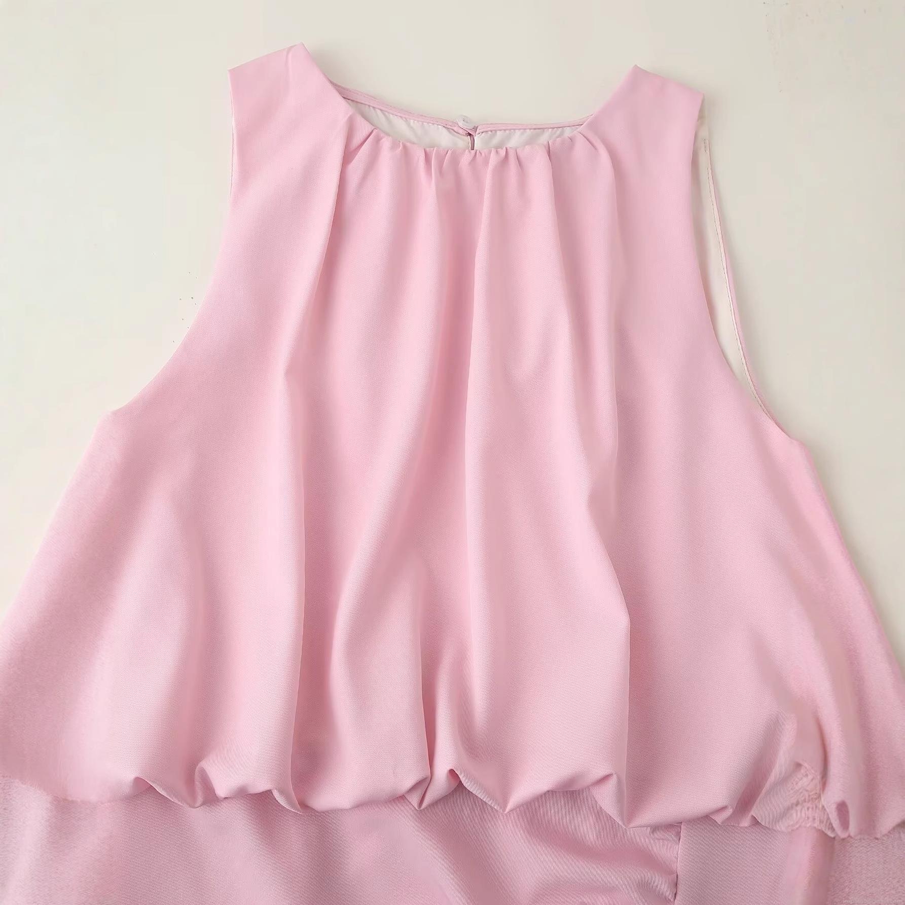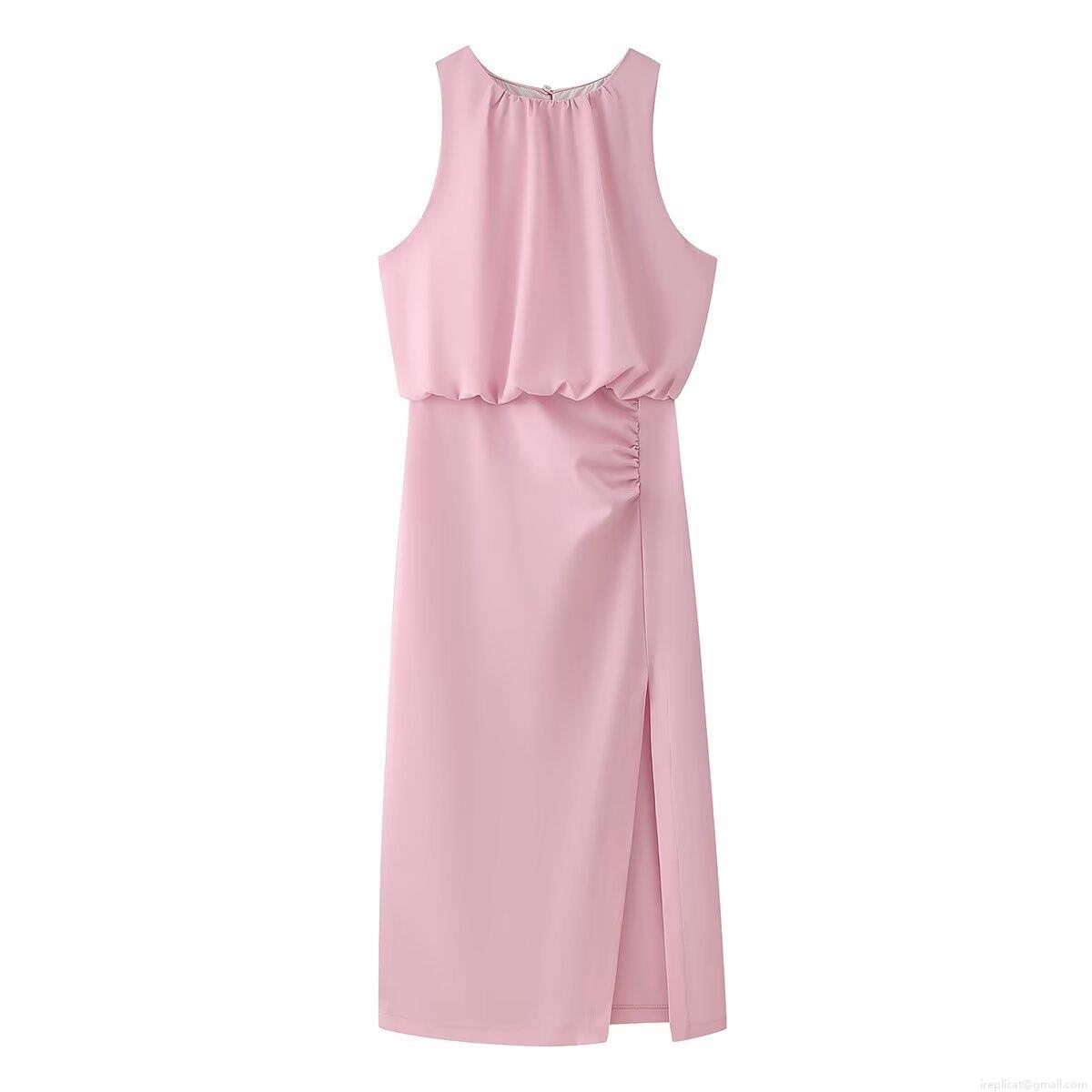 • Women Elegant Pink Sleeveless Round Neck Ruched Midi Dress Solid Color Side Slit Waist Pleated Casual Evening Party Summer Dress For Women Fashion
