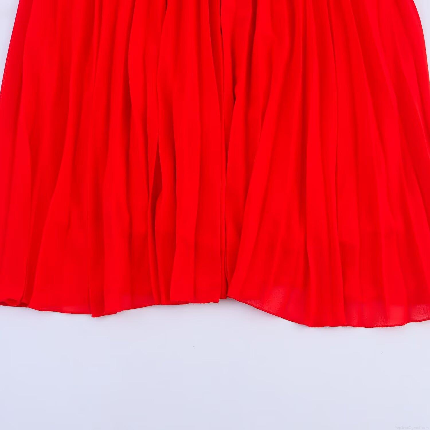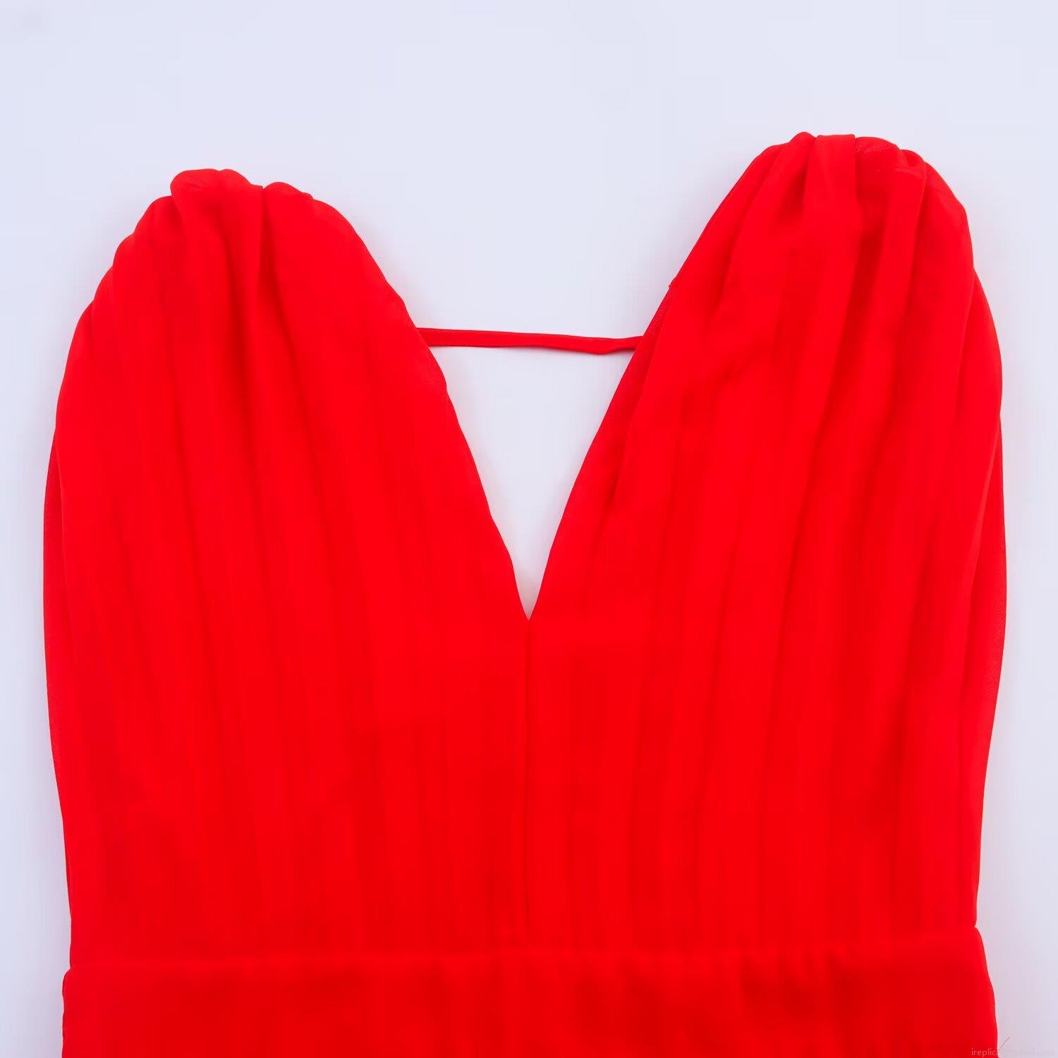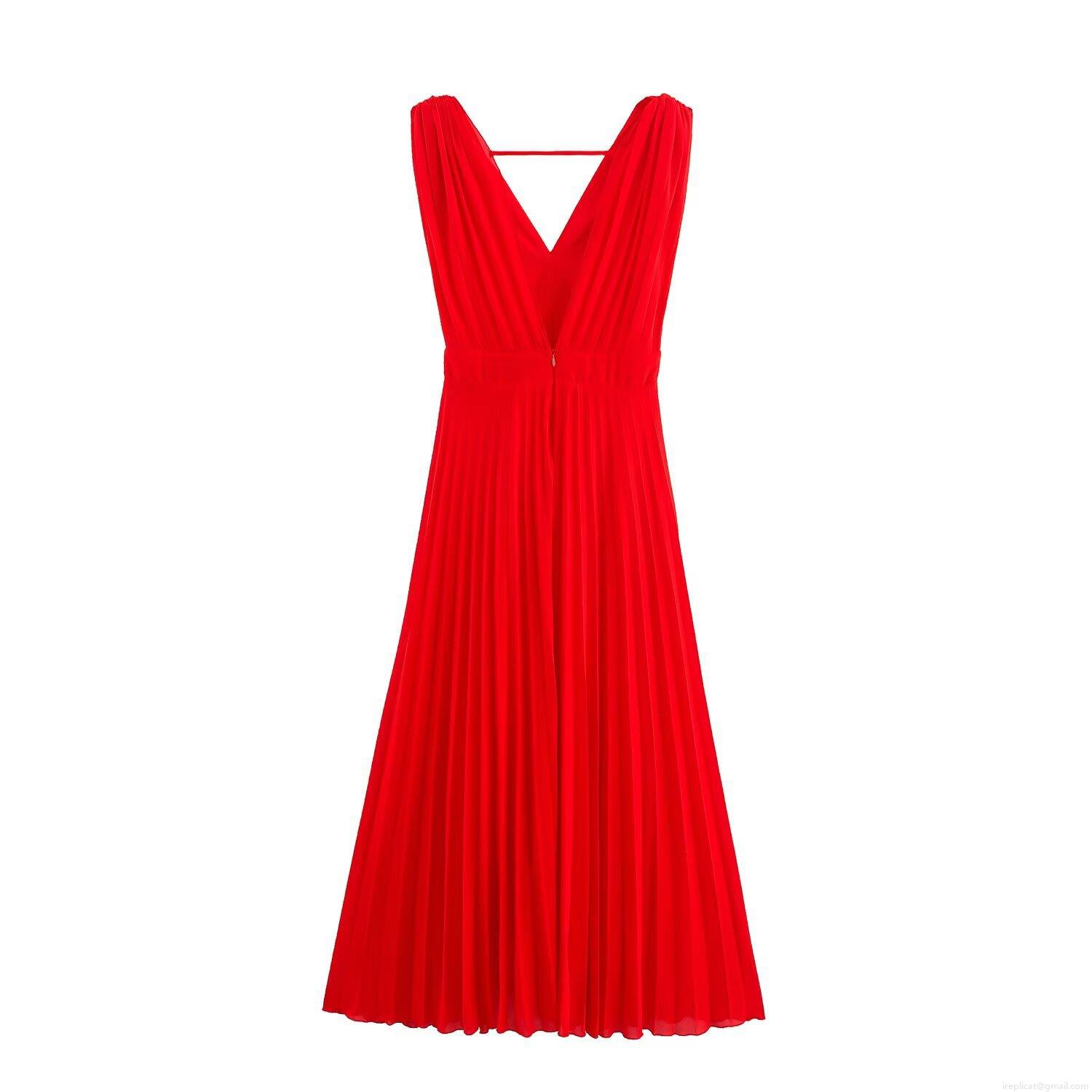 • Women Elegant Red V-Neck Sleeveless Pleated Midi Dress Sophisticated Polyester Chiffon Back Zipper High Waist Flowy Party Event Dress