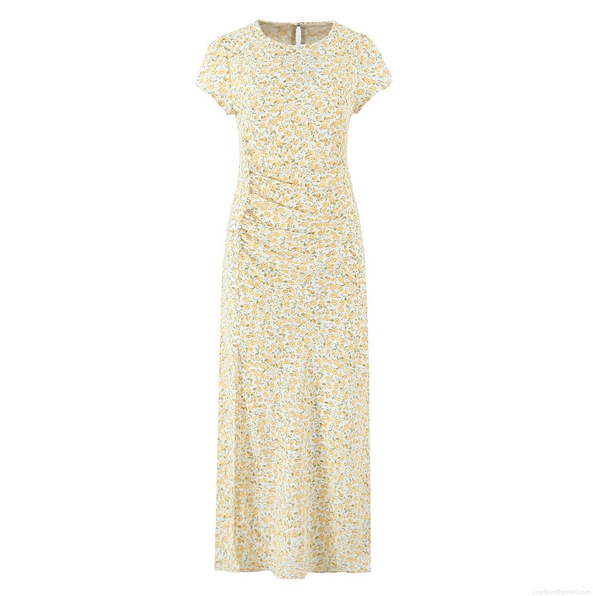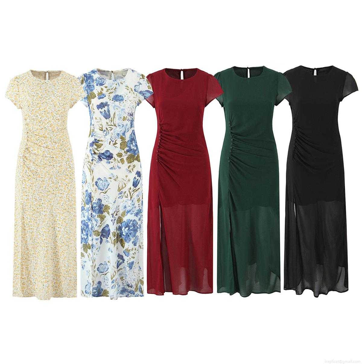 • Women Elegant Round Neck Short Sleeve Midi Dress Pleated Waist Side Split With Button Decoration Floral Solid Pattern Chiffon Style Polyester Summer Dress For Party Daily Wear