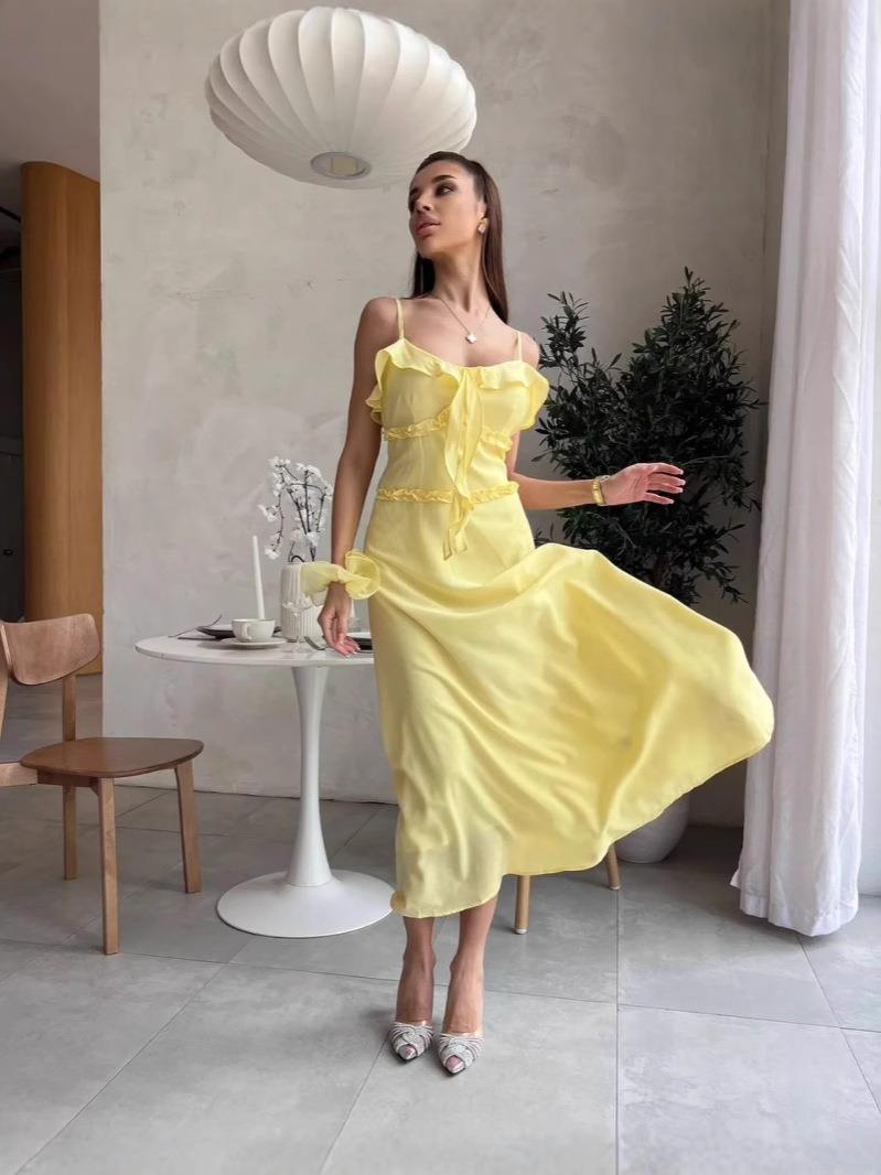 Women Elegant Ruffle Hem Cami Midi Dress Sexy Cotton Polyester Blend Summer Backless Sleeveless Solid Color Bow Tie Party Dress For Women