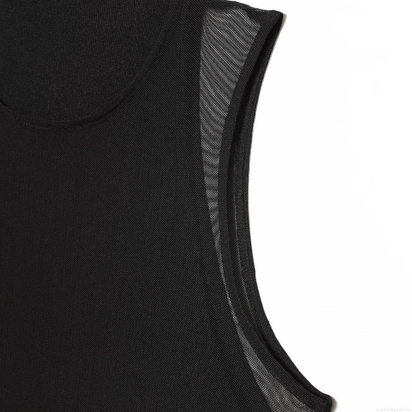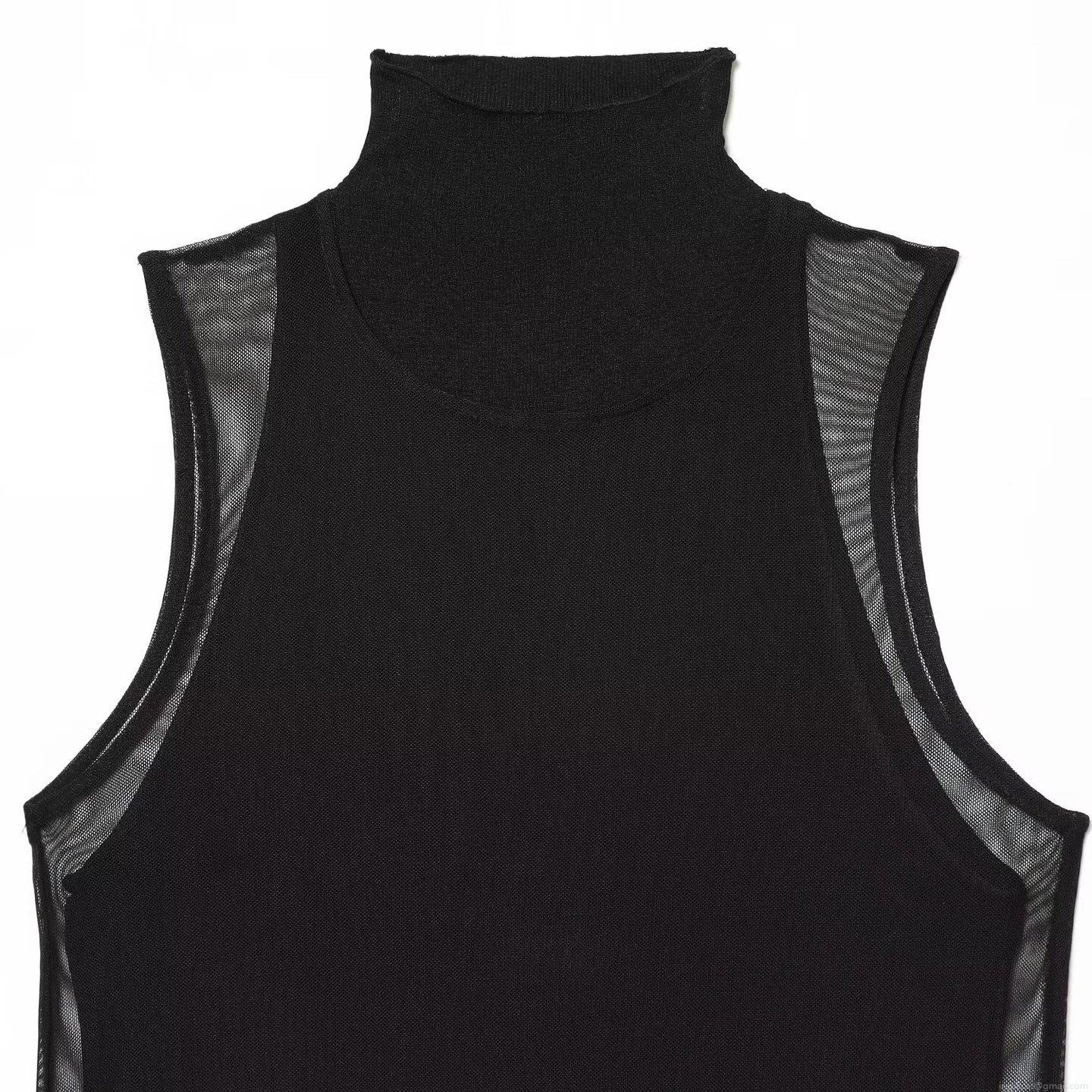 Women Elegant Sleeveless High Neck Midi Dress Mesh Splicing Asymmetric Hem Solid Black Slim Fit Elastic Dress For Evening Party Banquet Ladies Chic Clothing
