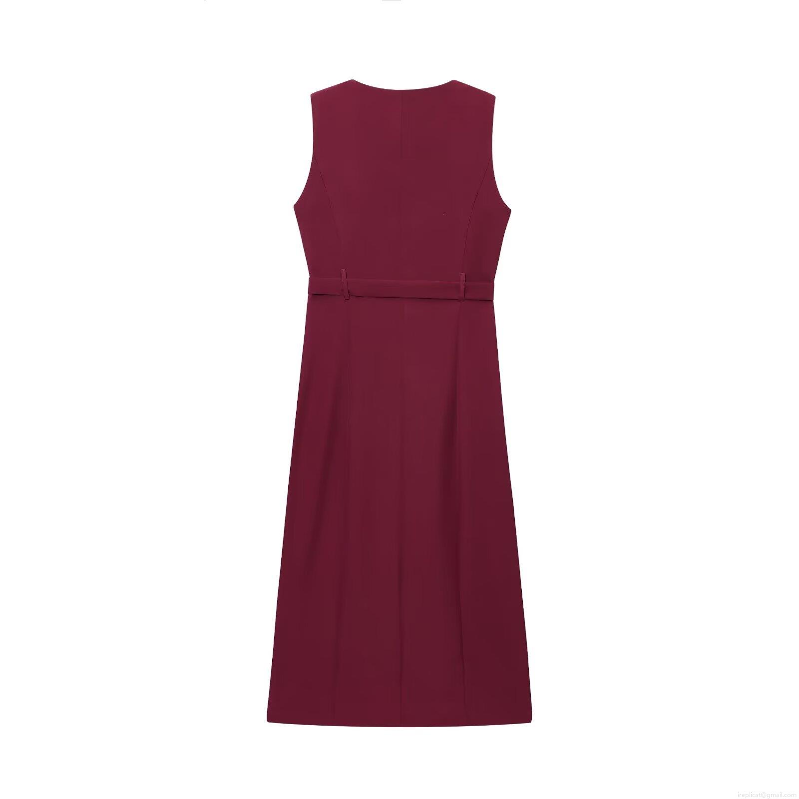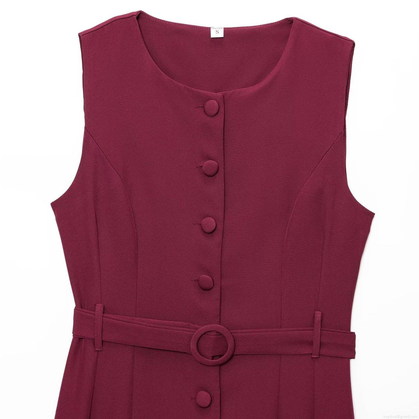 • Women Elegant Sleeveless Midi Dress Round Neck Single Breasted A-Line Dress With Belt High Waist Solid Color Polyester Spandex Dress For Summer Office Party