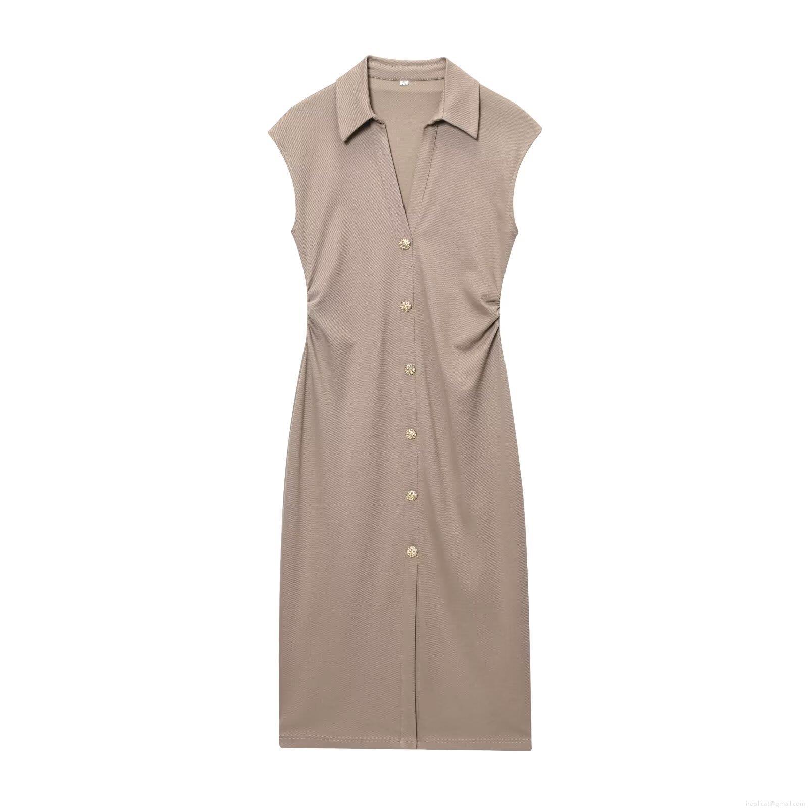 • Women Elegant Sleeveless V Neck Polo Shirt Dress Solid Color Pique Fabric Midi Dress With Gold Buttons Side Pleats For Summer Office Casual Lady