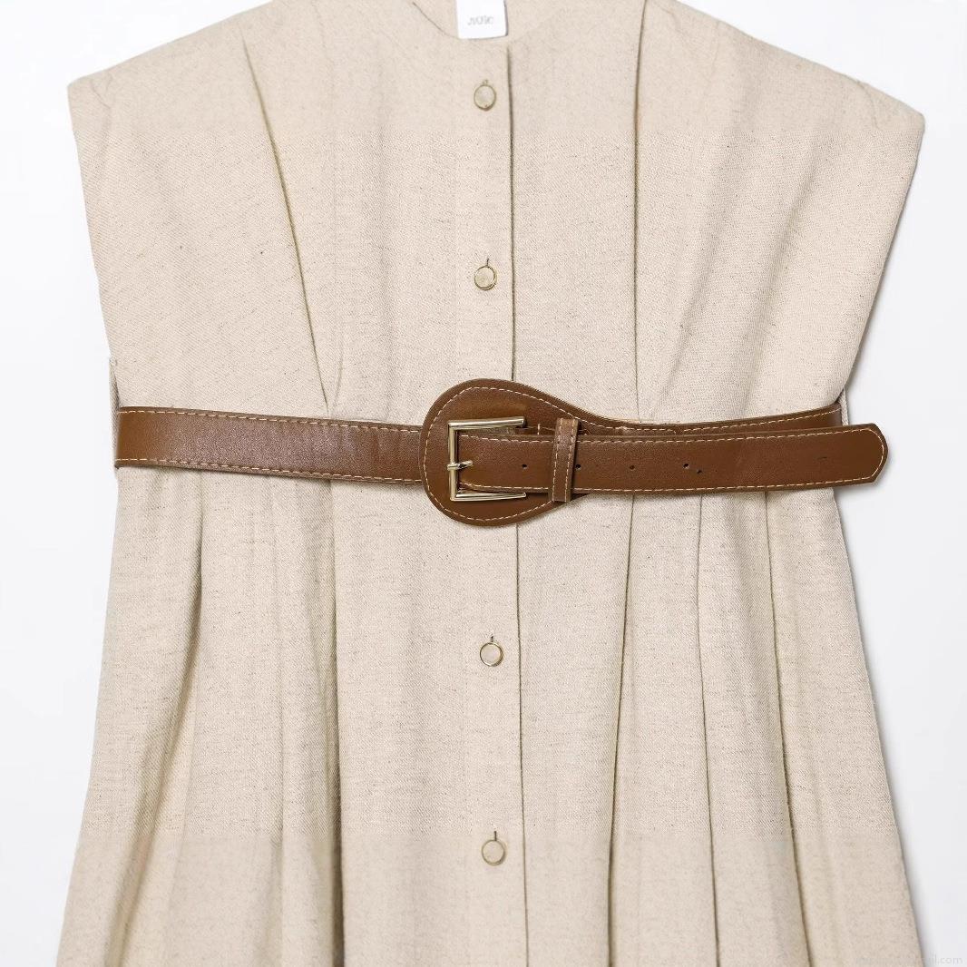 • Women Elegant Sleeveless V-Neck Button Down Midi Dress With Belt Solid Color Polyester Cotton A-Line Summer Casual Streetwear Long Dress