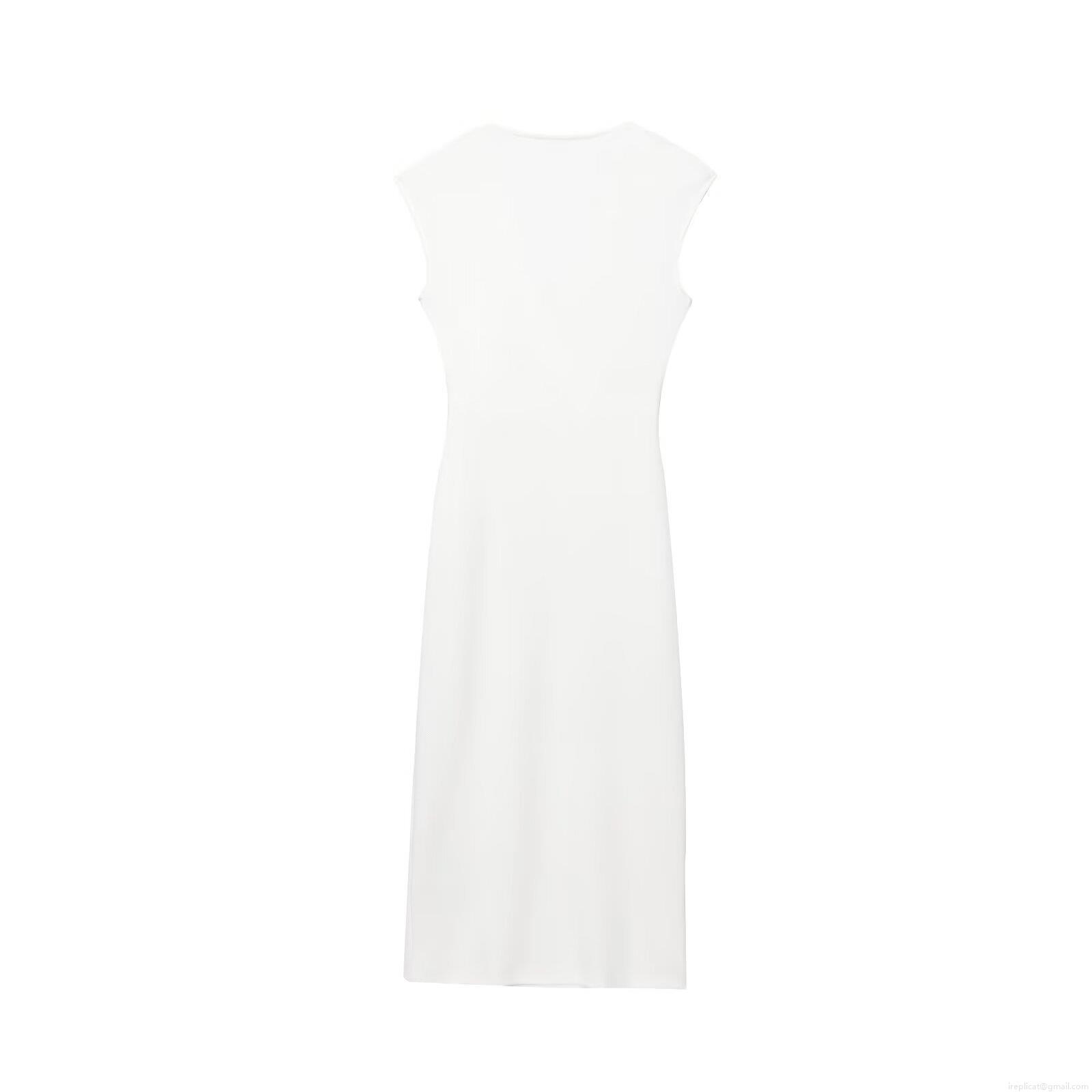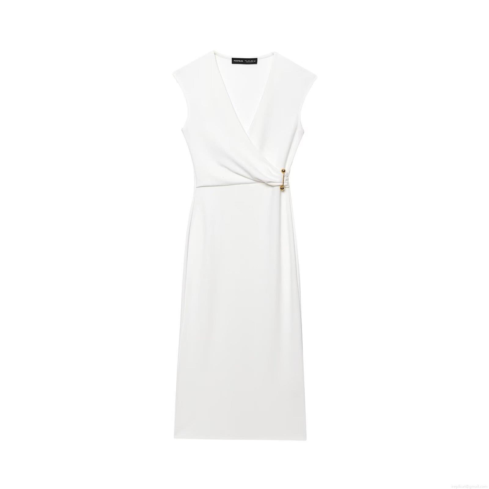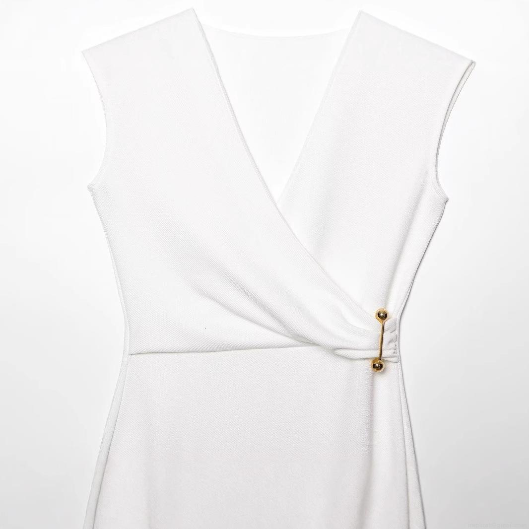 • Women Elegant Sleeveless V-Neck Midi Dress With Gold Metal Pin Decoration Solid White Slim Fit Straight Sheath Dress For Summer Party Office Lady