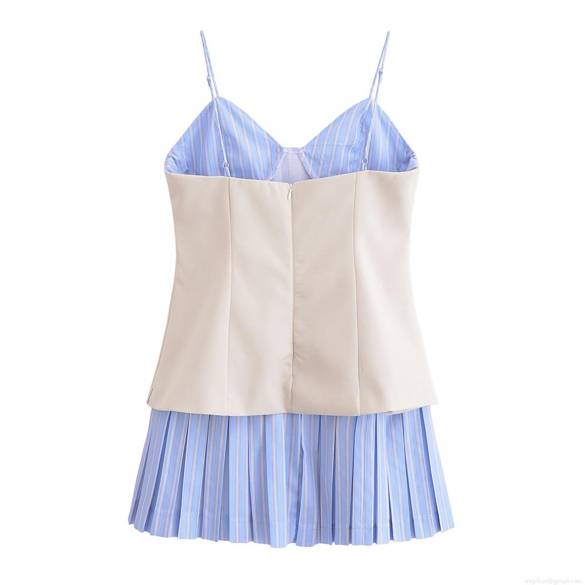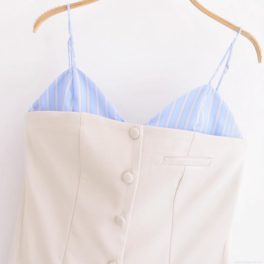 Splice, Stripe, Pleats, V-neck, Button Decoration, Thin Straps