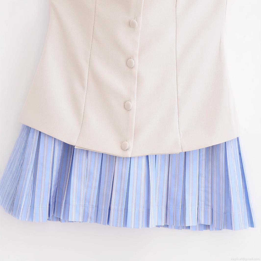 • Women Elegant Splicing V-Neck Sleeveless Dress Sweet Poplin Patchwork Striped Pleated Midi Dress With Buttons Decor For Party Summer