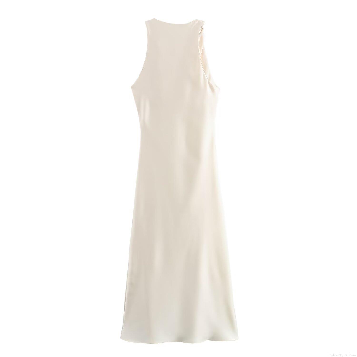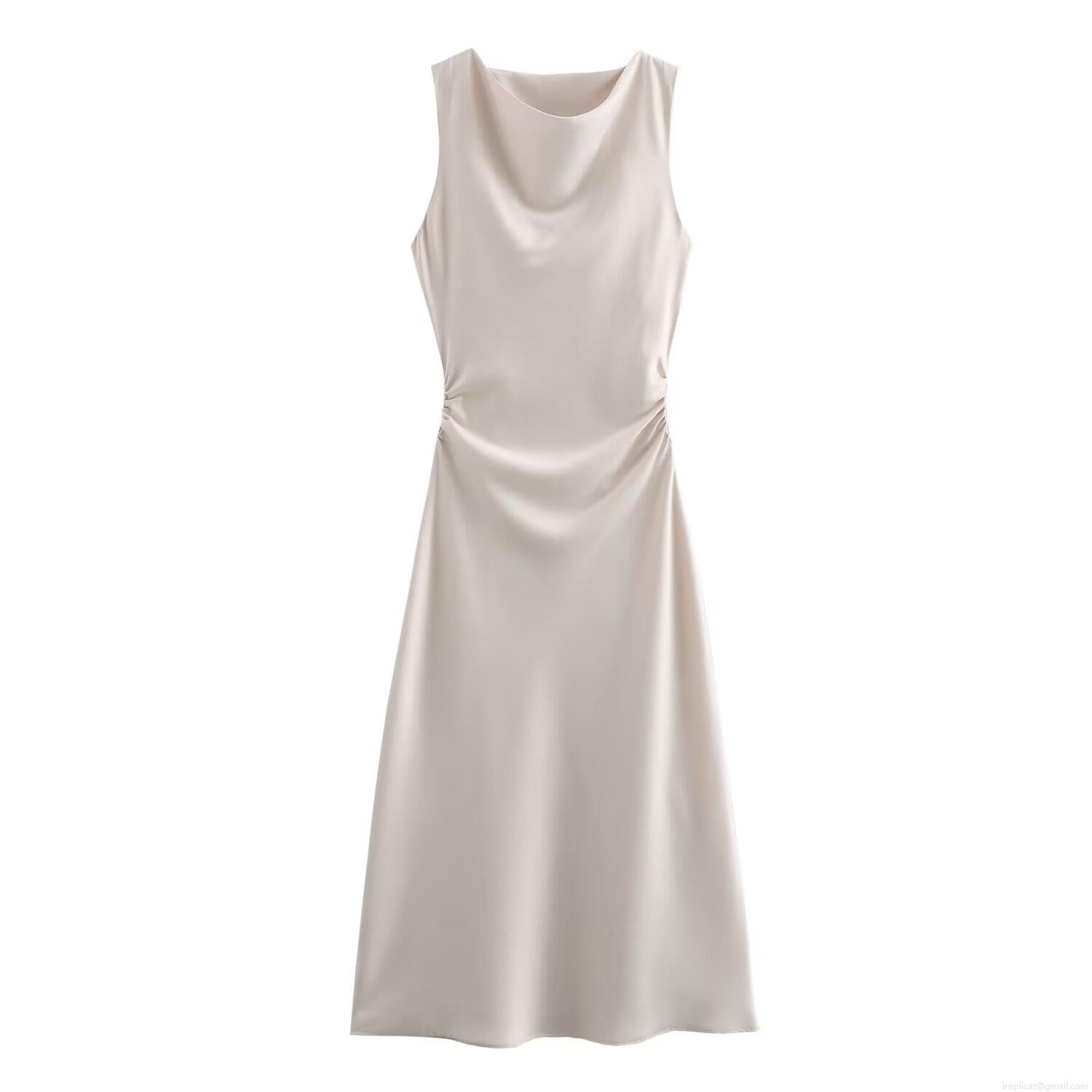 • Women Elegant U-Neck Satin Midi Dress Sleeveless Ruched Waist Party Evening Gown Polyester Solid Color Sexy Backless Slip Dress For Cocktail Club