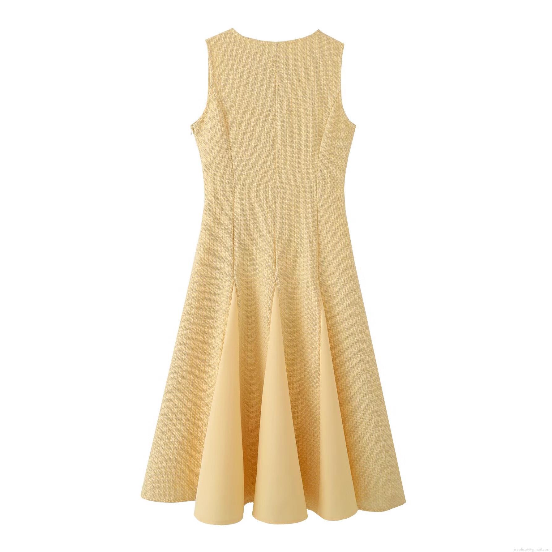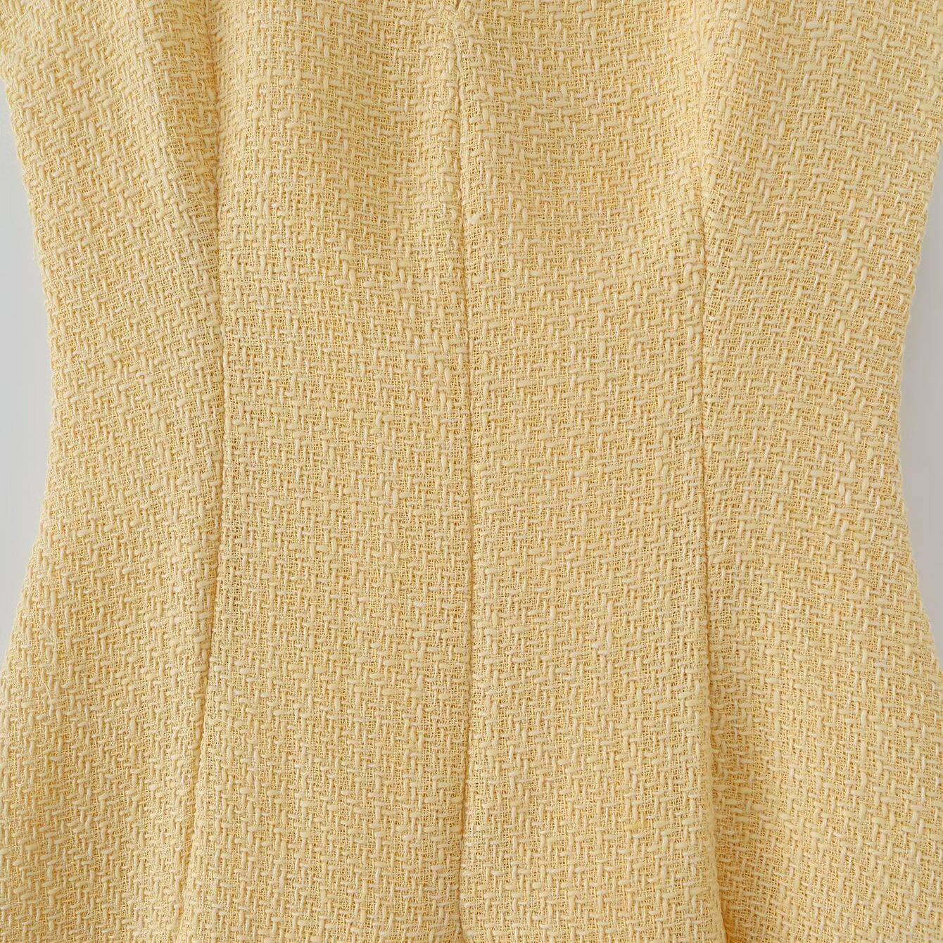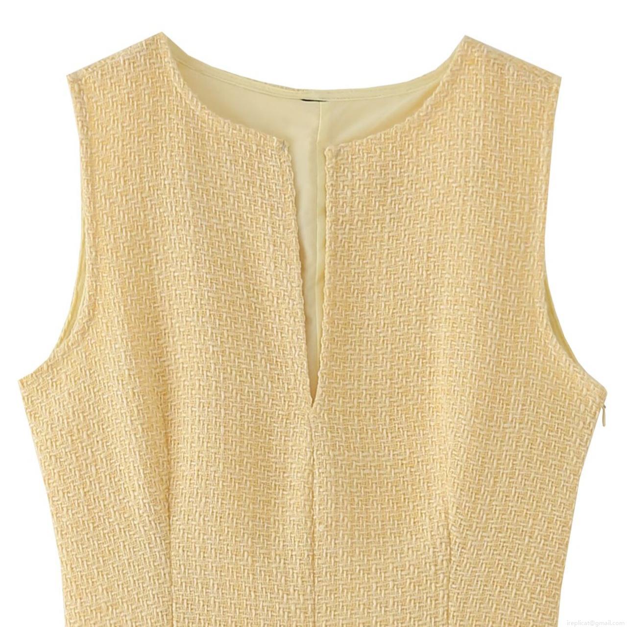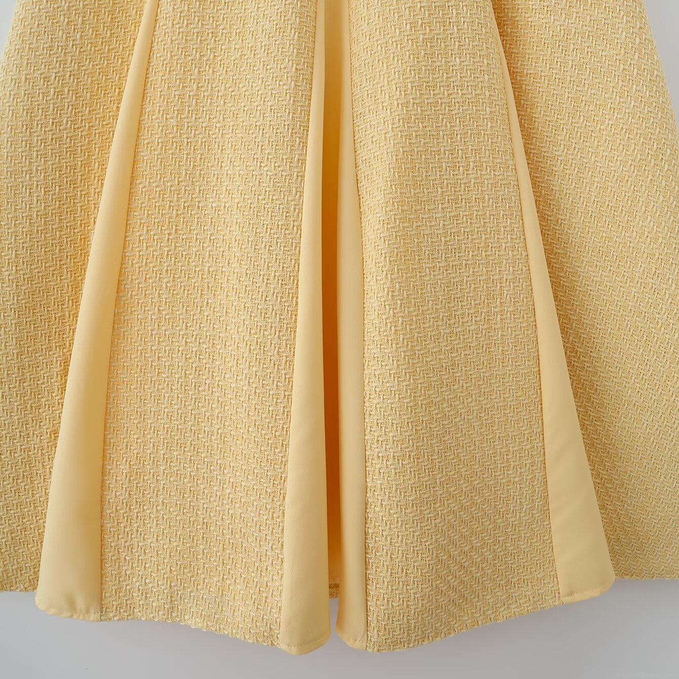 • Women Elegant V-Neck Sleeveless Tweed Patchwork Midi Dress Slim Fit A-Line Large Hem Pleated Commuter Party Dress Winter Fashion Yellow