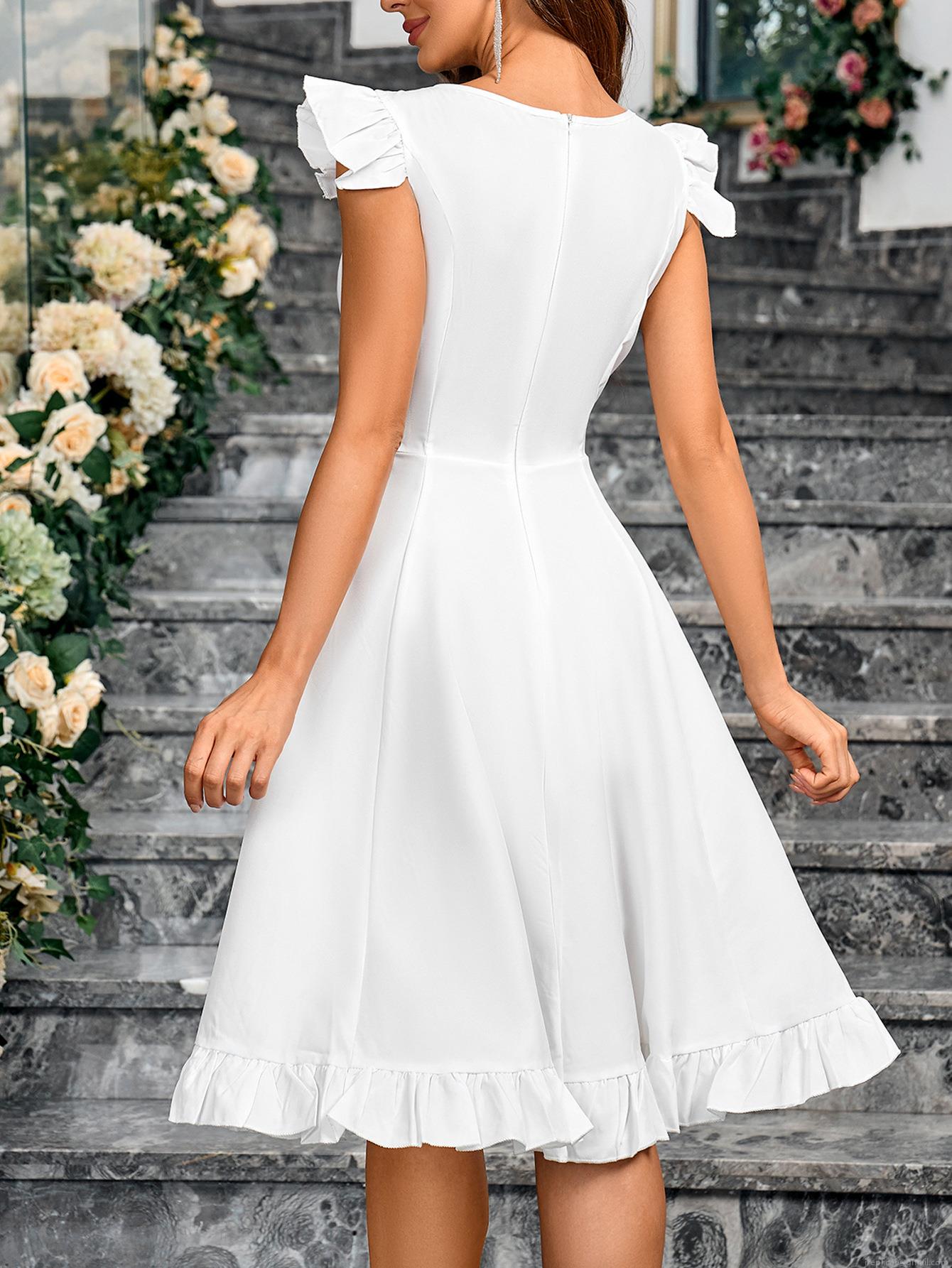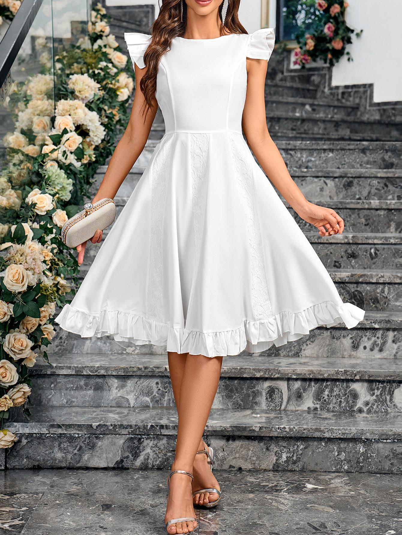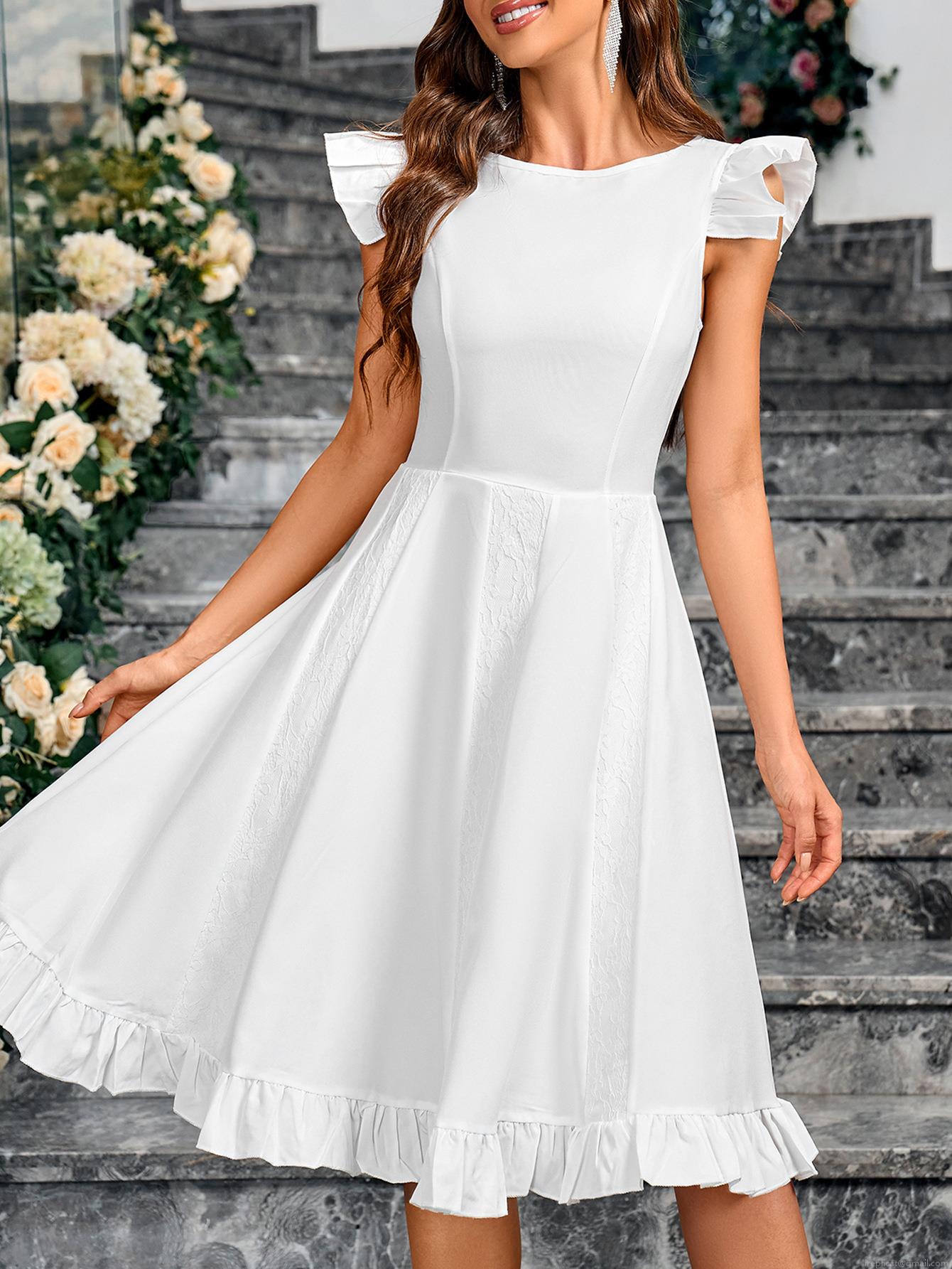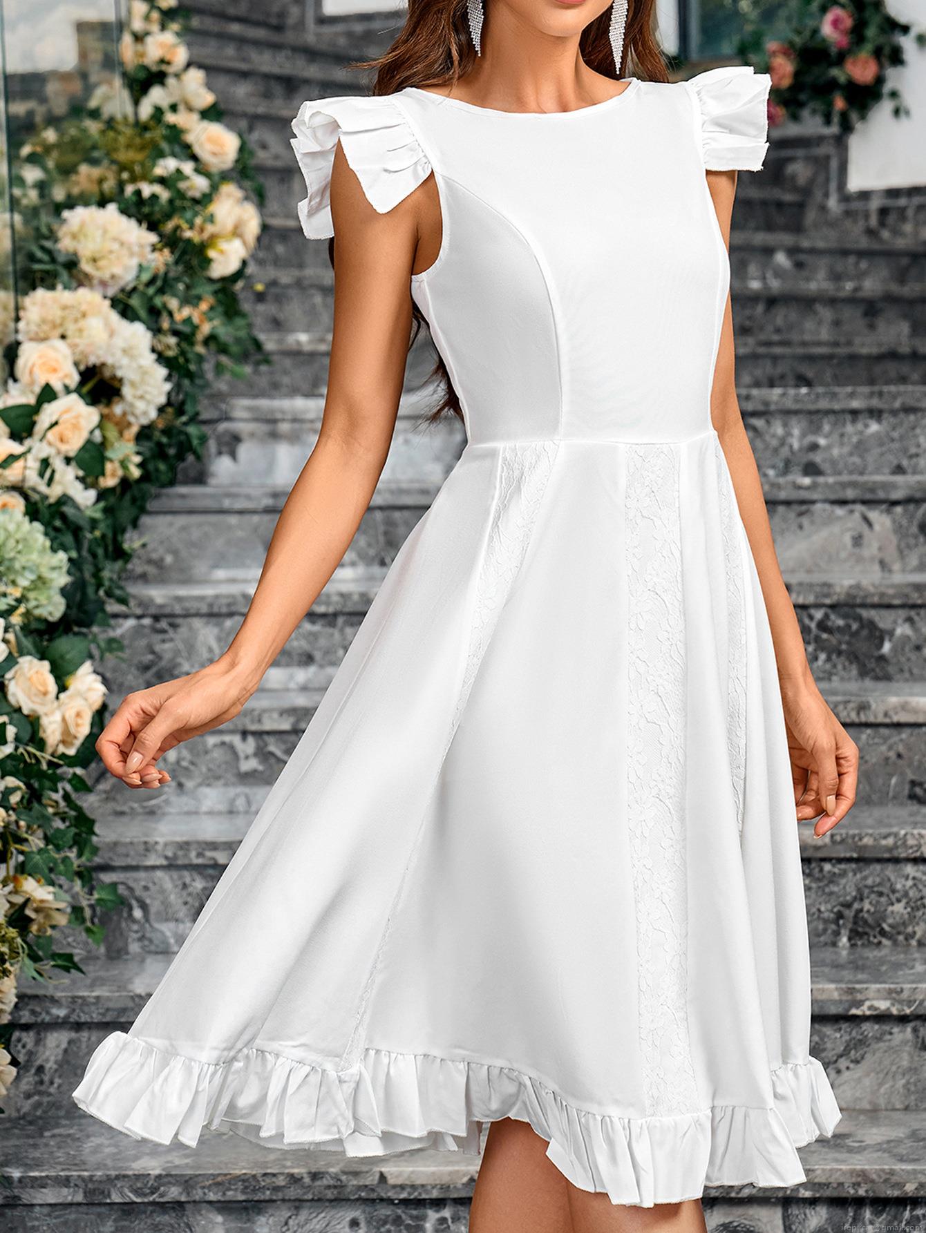 • Women Elegant White Sleeveless Midi Dress With Ruffle Flutter Sleeve Lace Patchwork A-Line Tutu Dress For Summer Party Vacation Ladies