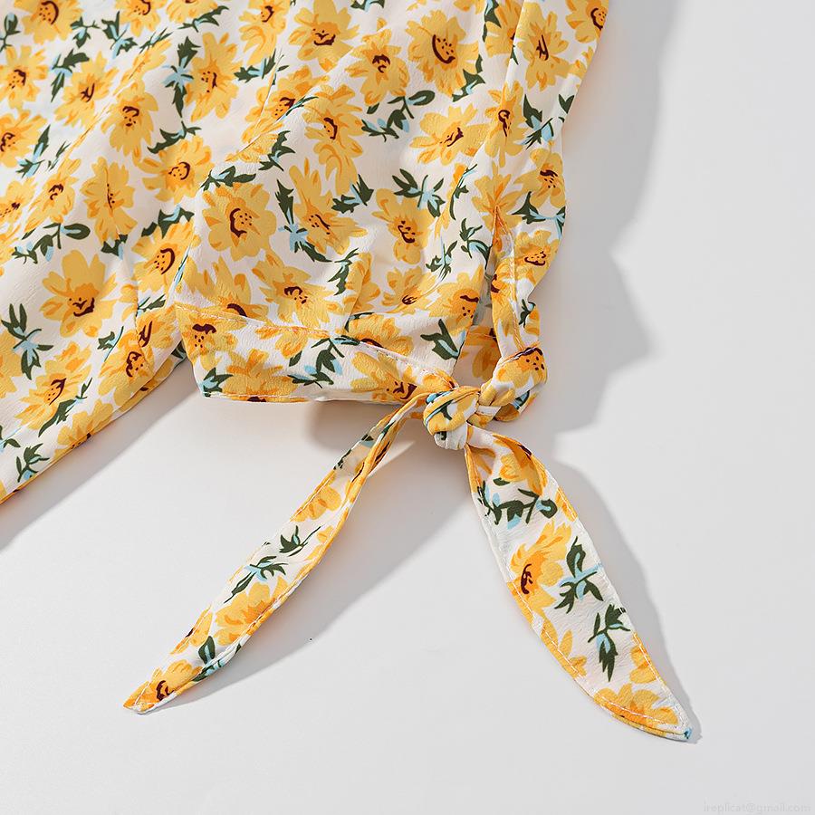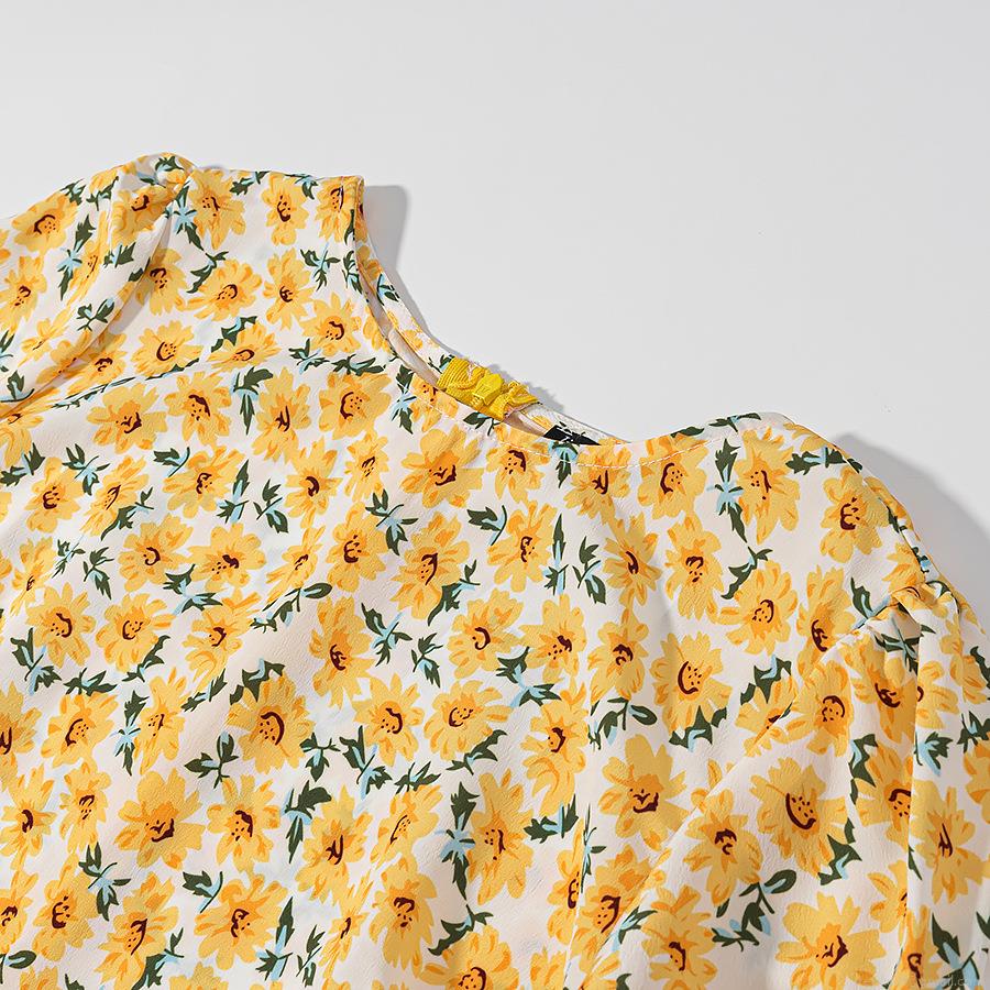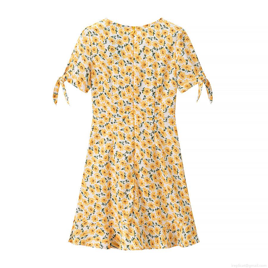 • Women Elegant Yellow Sunflower Floral Print Polyester Chiffon Midi Dress Short Sleeve Round Neck With Bow Tie Cuffs Back Zipper Summer Vacation Casual Party A-Line Dress