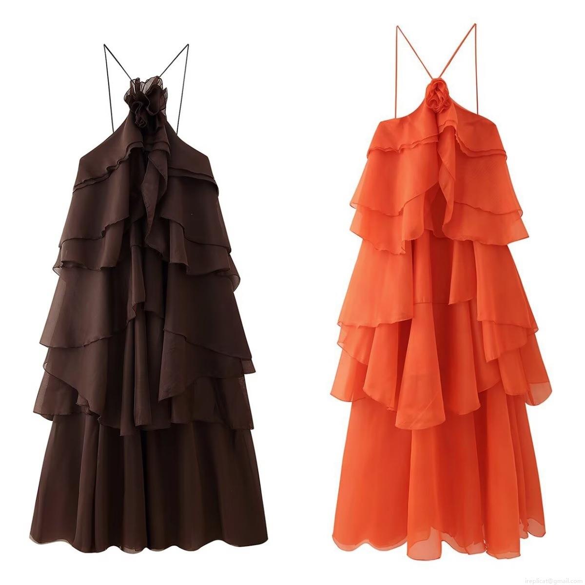• Women Fashion Halter Neck Tiered Midi Dress With 3D Flower Decoration Chic Layered Chiffon Cake Dress For Party Vacation Streetwear