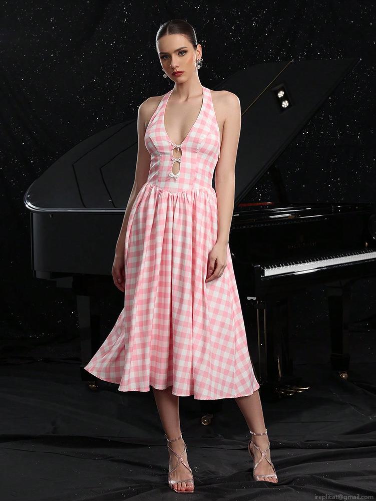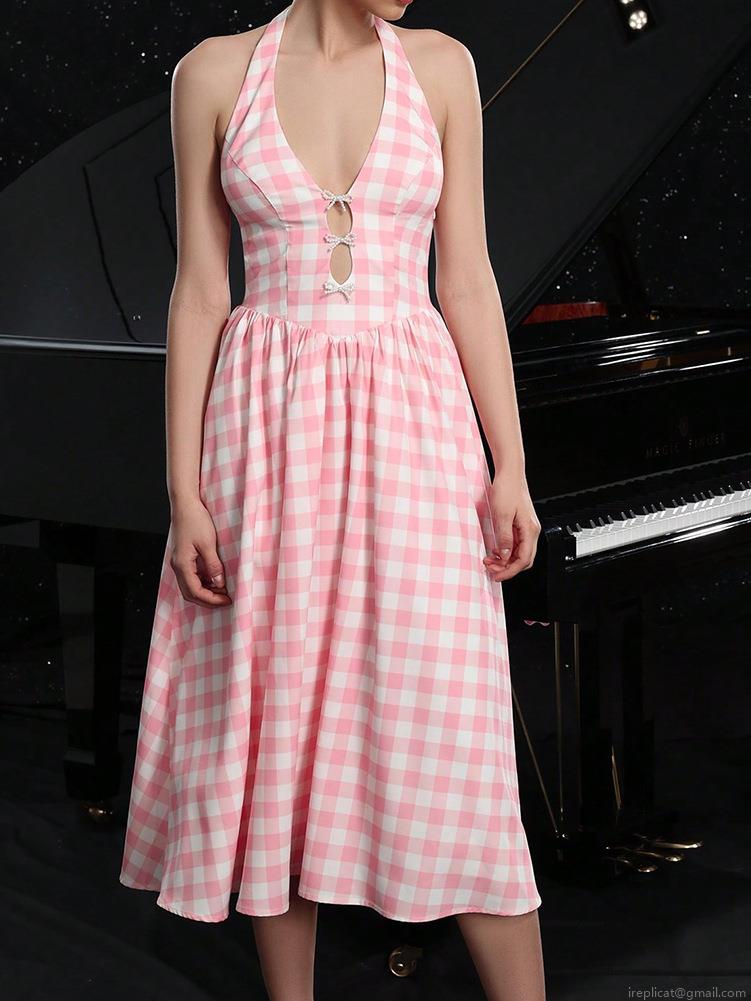 • Women Gingham Dress Halter Neck Pink White Elegant Hepburn Style Bow Knot Hollow Out High Waist A-Line Swing Summer Vacation Maxi Sundress